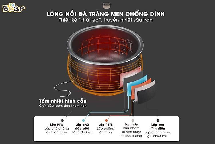 Ruột nồi cơm điện Bear DFB-B20A1 được làm từ chất liệu cao cấp rất dày dặn, tráng men đá tăng khả năng truyền nhiệt và chống dính tốt. Kết cấu của ruột nồi được chia làm 5 lớp chất liệu khác nhau cho chất lượng tốt hơn. Thiết kế dạng thắt eo tăng khả năng truyền nhiệt, giữ nhiệt và tản nhiệt đều giúp nấu cơm chín đều hơn.