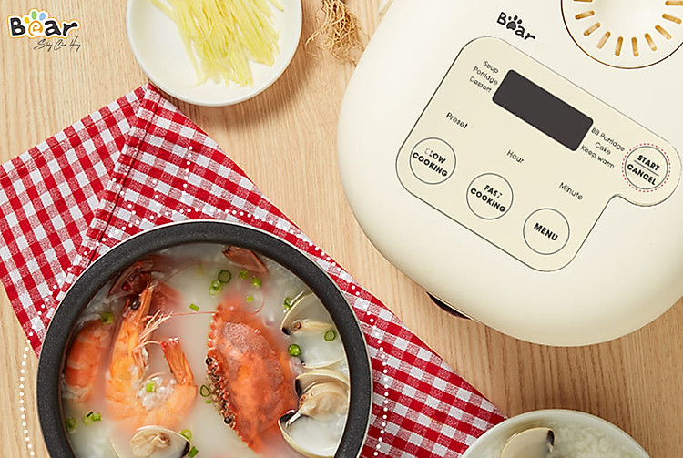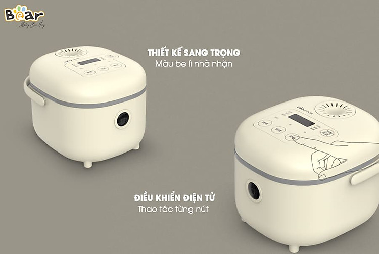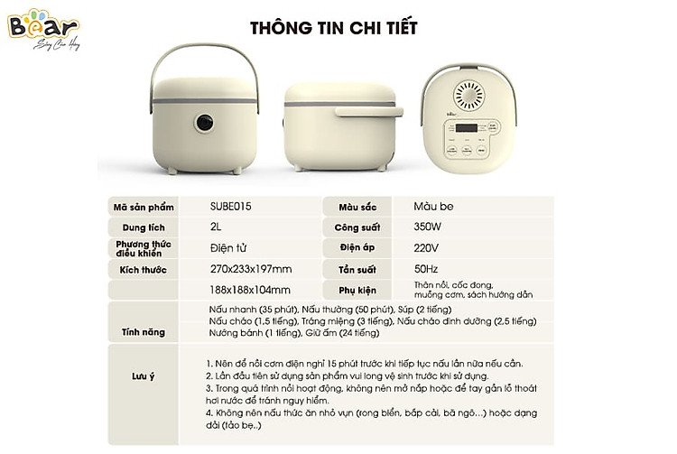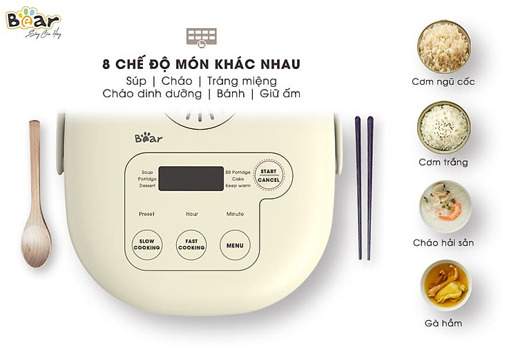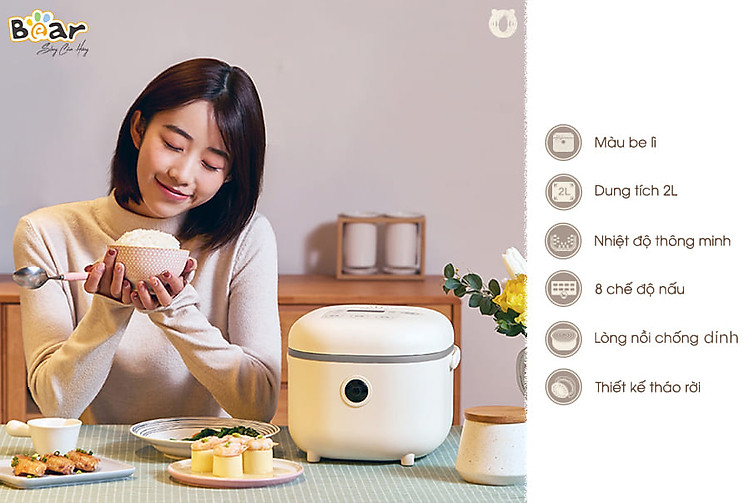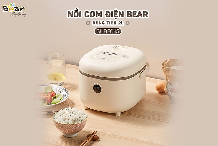 ồi cơm điện thông minh Bear DFB-B20A1 (SUBE015) tích hợp đến 8 chế độ nấu khác nhau, ngoài tính năng nấu cơm bạn có thể dùng nồi cơm điện mini Bear để làm các món ăn khác như nấu cháo, nấu canh, hầm, nướng bá vô cùng tiện lợi. Đặc biệt, chức năng nấu cơm của nồi cơm điện Bear được chia là 2 chế độ nấu nhanh một lửa và nấu chậm 2 lửa phù hợp với nhiều nhu cầu sử dụng và sở thích về độ chín, dẻo của cơm theo mong muốn của người dùng.