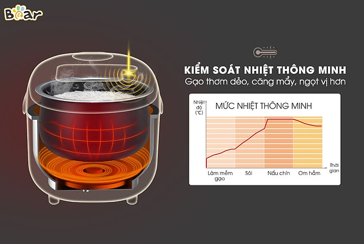 Nồi cơm điện Bear còn được tích hợp tính năng kiểm soát nhiệt tự điều chỉnh với nhiều mức nhiệt vô cùng thông minh. Theo thời gian nấu và loại nguyên liệu, món ăn nồi sẽ điều chỉnh nhiệt từ thấp đến cao hoặc từ cao về thấp mang đến hiệu quả nấu tốt hơn.