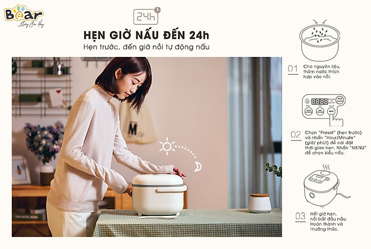Với tính năng hẹn giờ lên đến 24 tiếng cho phép bạn trải nghiệm và tận hưởng cuộc sống tốt hơn, giờ đây bạn có thể đi vắng cả ngày mà khi trở về vẫn có cơm nóng hổi cho cả gia đình thưởng thức vào đúng b