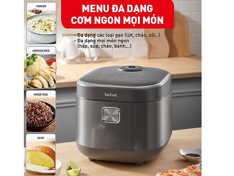 Nồi cơm điện tử Tefal được cài đặt đến 14 chương trình nấu chuyên dụng gồm: gạo trắng, cơm niêu, gạo lứt, gạo Nhật/Sushi, gạo nếp, gạo basmati, gạo hỗn hợp, cháo/súp, nấu chậm, bánh ngọt, hấp, nấu nhanh, hâm nóng, giữ ấm, 2 chọn lựa loại gạo: bình thường, dẻo.