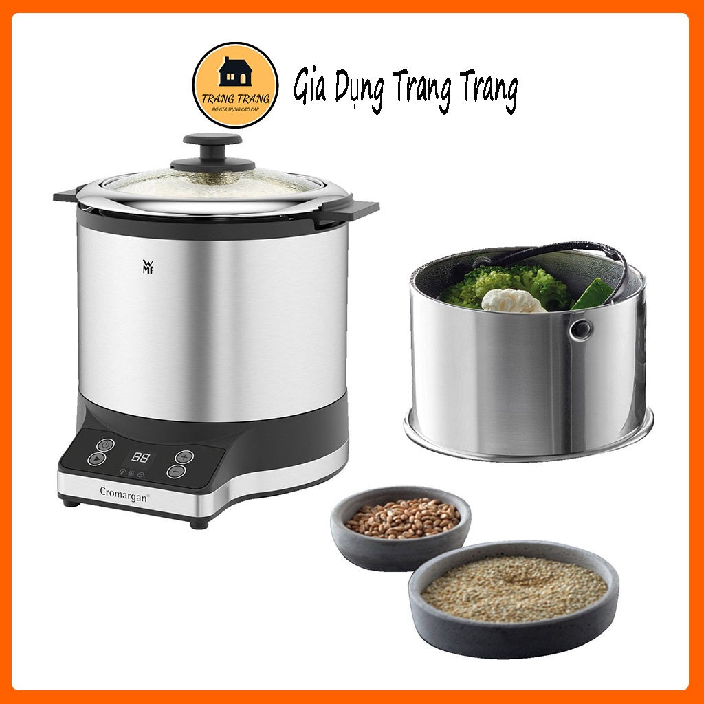 Giớ thiệu sản phẩm: - Với chiếc nồi cơm điện nhỏ gọn này các bà nội trợ tha hồ thay đổi đa dạng bữa ăn hằng ngày cho gia đình, thay thế gạo thông thường bằng gạo lứt hay các hạt ngũ cốc. Đặc biệt với gia đình nhiều thành viên nhưng lại có chế độ dinh dưỡng khác nhau thì nồi cơm điện mini WMF chính là đồ gia dụng lí tưởng để nấu các chế độ cơm khác nhau của mọi người. - Nồi Cơm Điện Mini WMF Kuchen được làm từ chất liệu cao cấp thép không gỉ 18/10, không bị bào mòn và oxi hóa, đặc biệt an toàn tuyệt đối với sức khỏe người tiêu dùng theo tiêu chuẩn Châu Âu. - Nồi Cơm Điện Mini cực tiện là nấu cơm xong, có thể đóng nắp đi kèm để thành 1 hộp cơm mang đi xinh xắn. - Nồi có tính năng hẹn giờ, tự động giữ ấm 40 phút. Ngoài ra còn có tính năng Hấp, Hầm, Giữ ấm. Lõi nồi cơm điện Mini có lớp chống dính cao cấp, dễ vệ sinh, đáy 2 lớp cho khả năng hấp thụ nhiệt nhanh và đều, giữ nhiệt tốt, giúp tiết kiệm nhiên liệu cũng như thời gian đun nấu tối đa. - Nồi cơm điện Mini WMF có hệ thống điều khiển thông minh, tiện lợi và dễ dàng sử dụng. Nắp kính trong suốt dễ dàng quan sát đồ ăn trong nồi, có tay cầm cách nhiệt.