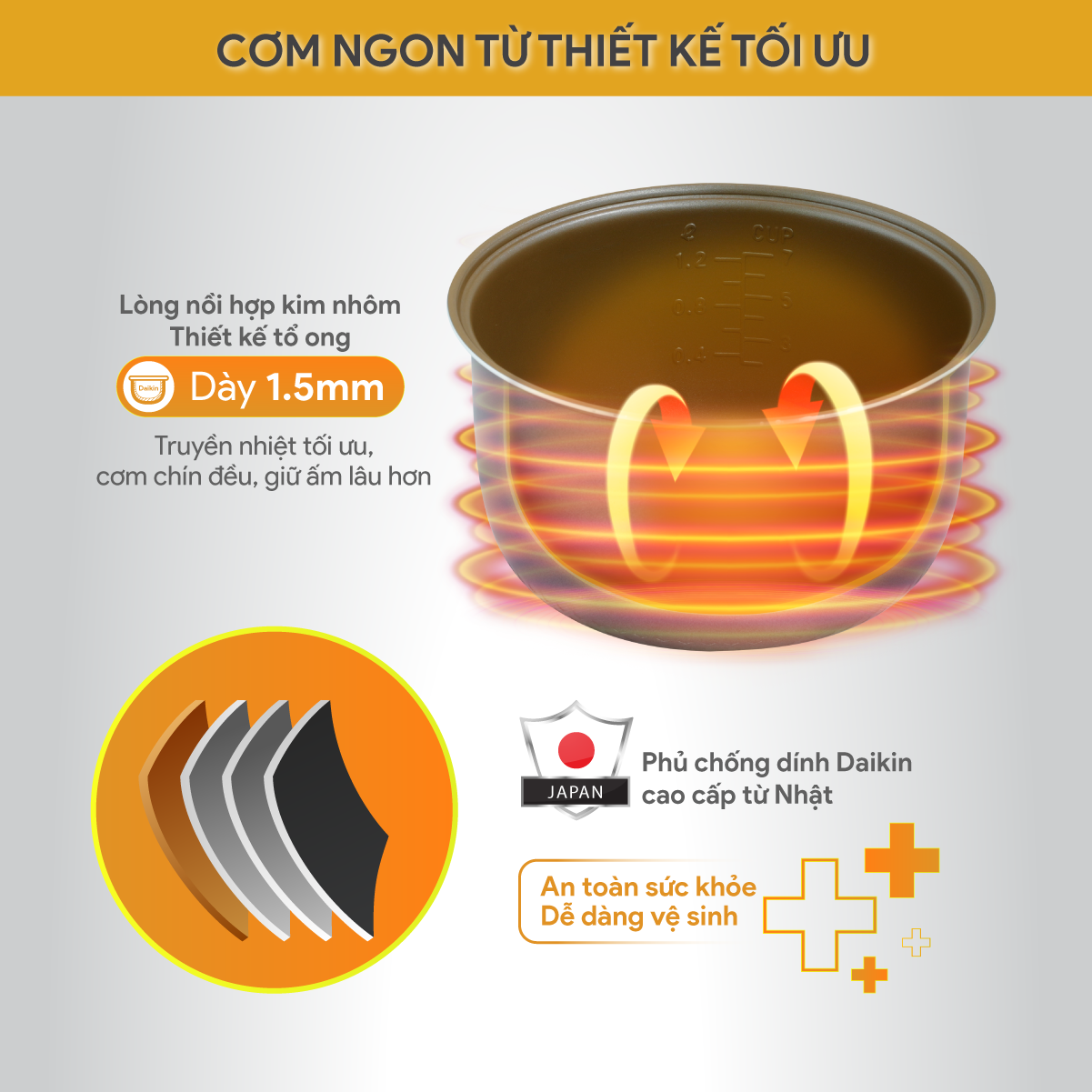 1. Lòng nồi dày 1.5 mm cùng thiết kế tổ ong đặc biệt được phủ lớp chống dính Daikin cao cấp => Truyền nhiệt đều và tốt, an toàn cho sức khỏe, vệ sinh nồi dễ dàng, cơm không bám dính hay cháy khét, chín dẻo, ngon.