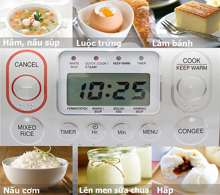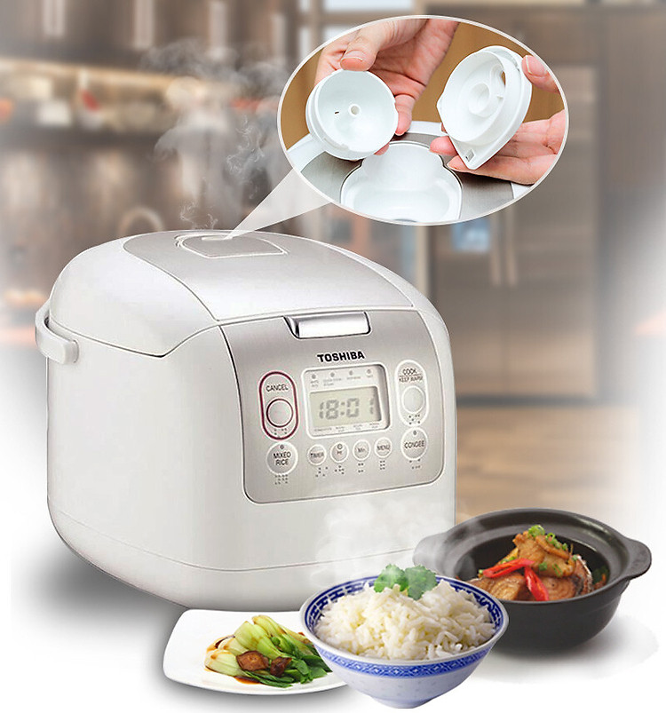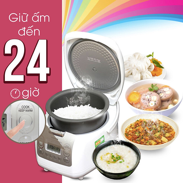 Nấu được nhiều món ăn ngonNồi cơm điện Toshiba với nhiều chế độ nấu tự động được cài sẵn: Nấu cơm trắng, nấu cơm nhanh (trong khoảng 30 – 40 phút), hấp, lên men, làm bánh bông lan, nấu súp, luộc trứng, hâm súp, nấu cơm trộn, nấu cháo.Điều chỉnh chế độ nấu bằng bảng điều khiển điện tử và màn hình hiển thị.