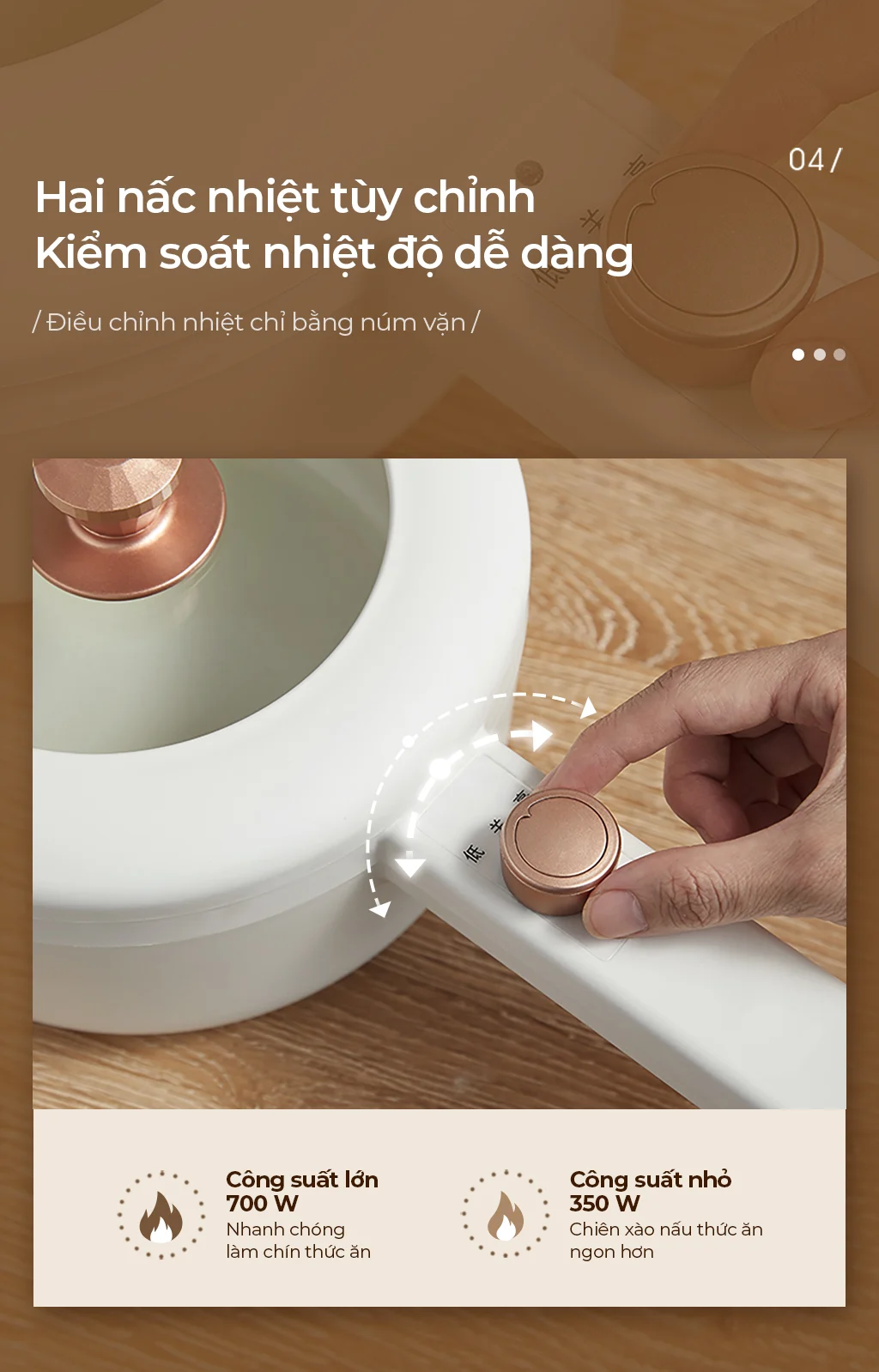 Nồi đa năng Bear DRG-P16M2 được thiết kế phần núm vặn ngay trên thân của tay cầm, người dùng có thể nhanh chóng thay đổi mức nhiệt cho phù hợp với nhu cầu sử dụng, đáp ứng đầy đủ các món như chiên, xào, hấp, nấu canh, lẩu...