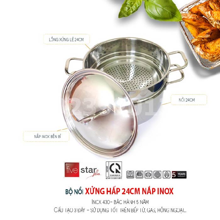 Bộ nồi xửng hấp 24cm nắp inox Fivestar cao cấp được chế tạo từ inox nhập khẩu Hàn Quốc, có độ sáng bóng và độ bền cao. Bề dày của nồi đạt tiêu chuẩn quốc tế là 8cm...