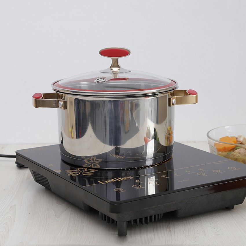 - Quai đinh tán, vung kính chịu nhiệt giúp dễ dàng quan sát thực phẩm khi đun nấu - Tay cầm được gắn vào thành nồi bằng đinh tán có nhựa bọc cách nhiệt. - Thiết kế sang trọng, đẹp mắt.
