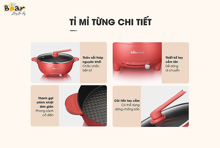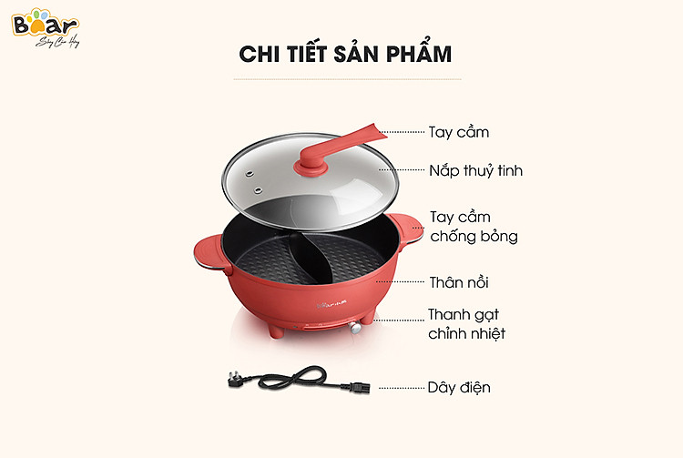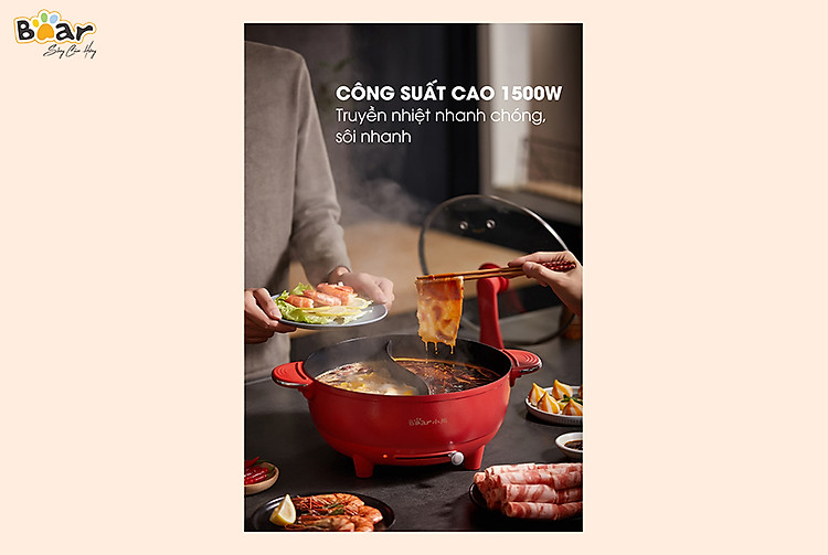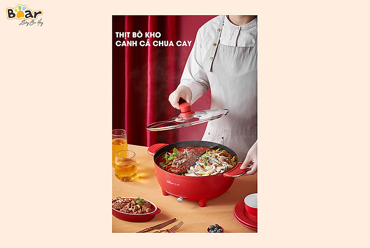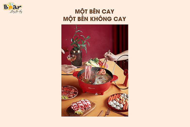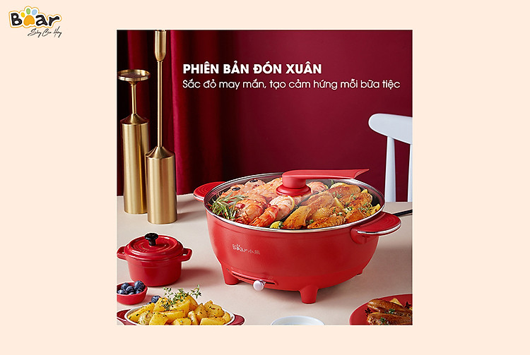 Nồi lẩu đa năng Bear SUBE006 2 ngăn thuộc phiên bản sắc xuân với thiết kế mang màu đỏ trầm may mắn, tạo cảm hứng cho mỗi bữa tiệc gia đình bạn thêm đầm ấm hơn.