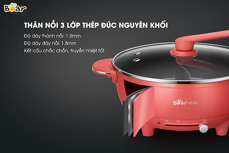 Thân nồi lẩu uyên ương Bear được làm từ thép đúng nguyên khôi với kết cấu 3 lớp vô cùng chắc chắn giúp cân bằng giữa cách nhiệt, truyền nhiệt và giữ nhiệt tốt hơn. Chất liệu nồi mang lại sự bền bỉ và đảm bảo an toàn khi sử dụng với độ dày thân nồi lên đến 1,5cm còn độ dày đế nồi là 1,8cm và bao phủ bên ngoài là lớp cách điện tuyệt đối, chống rò rỉ.