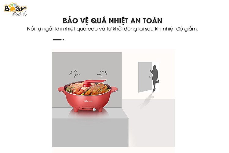 Nồi lẩu uyên ương Bear được trang bị chế độ tự ngắt thông minh, khi nhiệt quá cao nồi sẽ tự động ngắt và khởi động lại sau khi nhiệt độ giảm. Nhờ vậy bạn không phải lo lắng phải điều chỉnh nhiều khi sử dụng nồi trong thời gian dài, đồng thời tiết kiệm điện năng hiệu quả.
