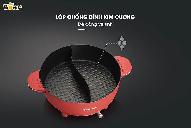 Đáy nồi lẩu uyên ương Bear được phủ lớp chống dính bằng chất liệu cao cấp, đảm bảo an toàn khi sử dụng. Đặc biệt, thiết kế lớp chống dính kim cương giúp bạn dễ dàng vệ sinh và dễ dàng hơn khi nấu nướng.