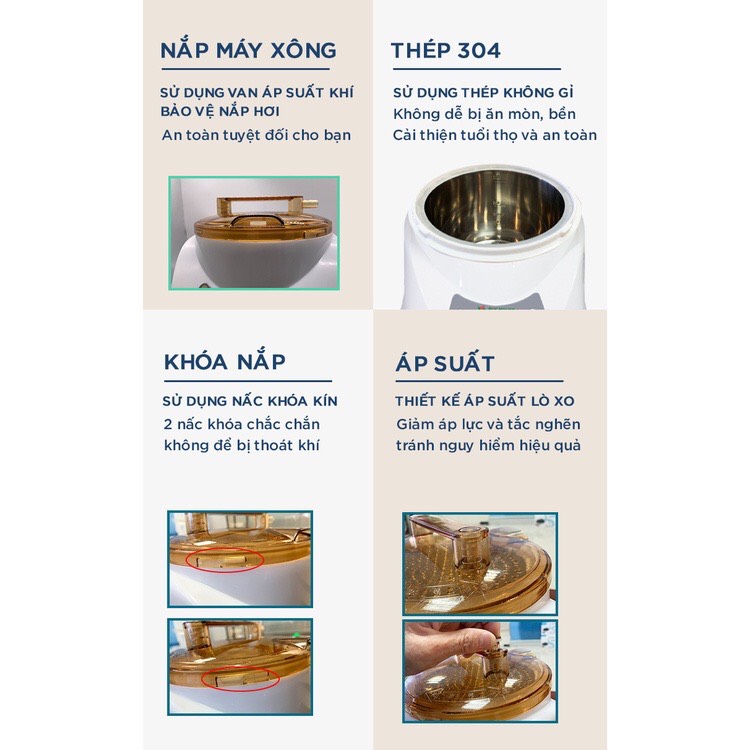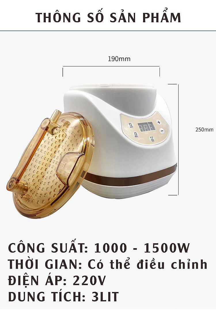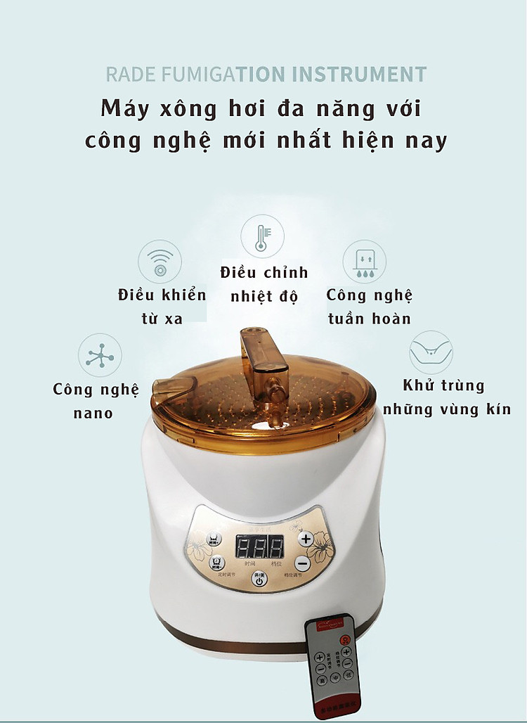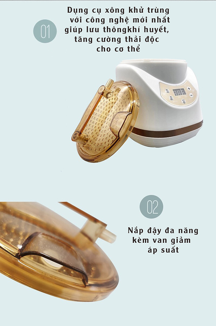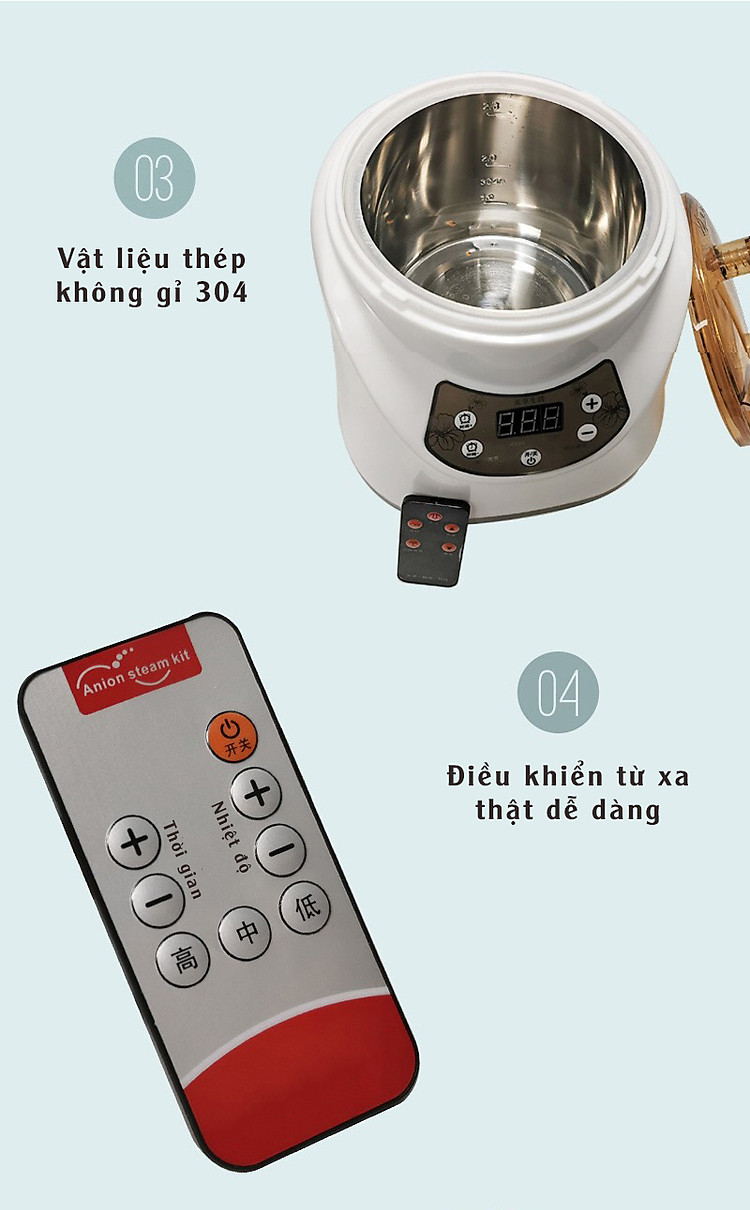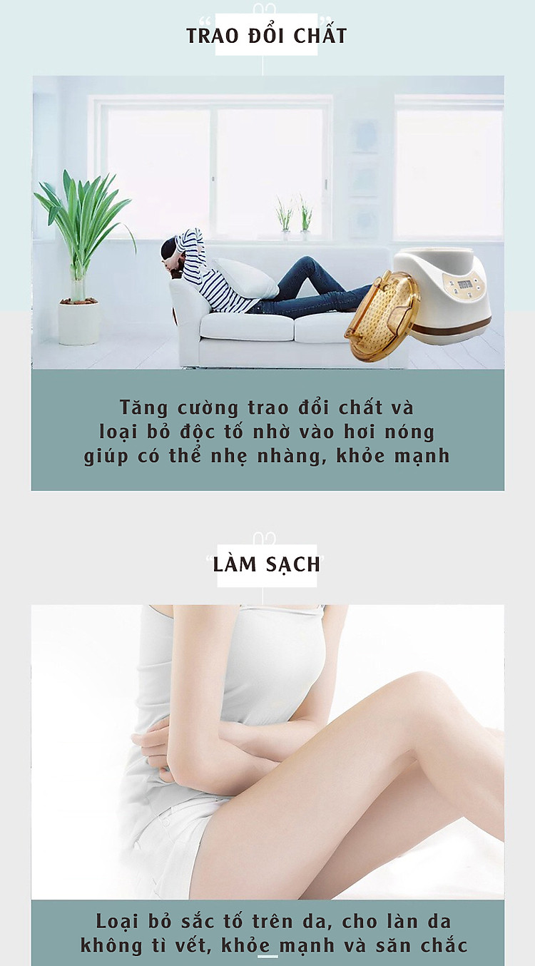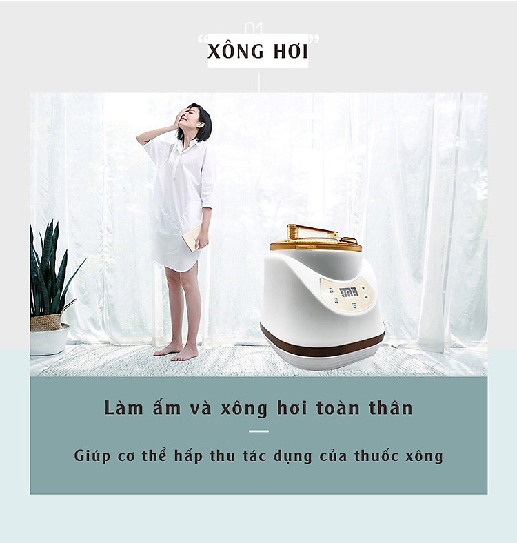 * NHỮNG LỢI ÍCH CHO SỨC KHỎE KHI SỬ DỤNG NỒI XÔNG - Giúp tăng cường hệ miễn dịch- Hỗ trợ điều trị các bệnh cảm cúm, cảm lạnh do thay đổi thời tiết- Làm sạch phổi, thông thoáng đường thở - Loại bỏ bụi bẩn, tế bào chết trên bề mặt da- Khử mùi hôi trên cơ thể- Cải thiện lưu thông máu, giúp tăng cường sức khỏe tim mạch- Giảm căng thẳng, mệt mỏi- Giúp thư giãn cơ bắp sau tập luyện thể thao hay hoạt động quá sức- Tăng tính linh hoạt cho các khớp- Hỗ trợ đốt cháy calo giúp giảm cân* NHỮNG ĐIỀU ĐẶC BIỆT CỦA NỒI XÔNG - Nắp máy có VAN ĐỐI LƯU chống cháy nổ- Nồi xông có dung tích đến 2.8 lít nên xông được thời gian dài- Dây điện bằng lõi đồng được bọc cách điện an toàn- CẢM BIẾN an toàn TỰ ĐỘNG NGẮT khi nồi xông cạn nước hoặc nhiệt độ xông quá cao- Màn hình điều khiển với các nút bấm dễ sử dụng (đi kèm với máy còn có một điều khiển từ xa) - Máy nhỏ gọn dễ dàng mang đi - Máy có thể kết hợp với Lá Xông Giải Cảm, Xông Tắm Sau Sinh - HỘP ĐIỀU HƠI có đế bằng GỖ khắc chữ đẹp và sang trọng* NHỮNG NGƯỜI NÊN SỬ DỤNG NỒI XÔNG - Những người mới bị cảm, không thoát mồ hôi được- Người có tiền sử mắc các bệnh về đường hô hấp như: viêm xoang, viêm phế quản, hen suyễn, - Phụ nữ có nhu cầu làm đẹp da, tẩy tế bào chết- Phụ nữ sau sinh- Người đang căng thẳng, mệt mỏi cần thư giãn đầu óc- Những người tập luyện thể thao, hoạt động quá sức cần thư giãn cơ bắp- Những người gặp các vấn đề về xương khớp* CẤU TẠO CỦA NỒI XÔNG- 1 Nồi xông dung tích 2.8L - 1 Nắp bảo vệ- 1 Điều khiển từ xa- 1 Bộ chuyển đổi nhựa- 1 Ống dẫn hơi- 1 Phích cắm điện* HƯỚNG DẪN SỬ DỤNG:Bước 1: Nối một đầu của ống dẫn hơi vào nắp, sau đó cho khoảng 2.8 lít nước vào máy, đậy nắp vặn chặt theo gờ đã cố địnhBước 2: Nối đầu còn lại của ống dẫn hơi vào một đầu của bộ chuyển đổi nhựaBước 3: Tiếp theo ta nối đầu còn lại của bộ chuyển đổi nhựa với đầu nối của hộp điều hơiBước 4: Sau đó ta có thể bỏ tinh dầu hoặc hương liệu vào hộp điều hơi, sau đó tiến hành cắm điện, khởi động máy.Lưu ý: Phần nhiệt độ ban đầu ở mức 9 sau 2 phút nước trong máy sẽ sôi và bắt đầu hóa hơi, khi đó ta điều chỉnh nhiệt độ xuống mức phù hợp để máy hoạt động bình thườngĐặc biệt khi mua máy chúng tôi sẽ gửi kèm Hướng dẫn sử dụng để thuận lợi cho quá trình sử dụng của khách.