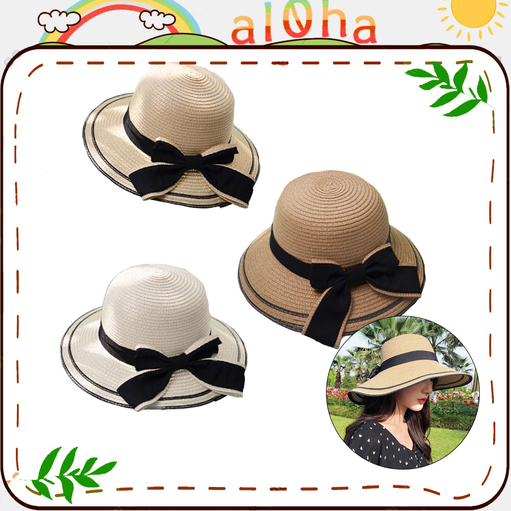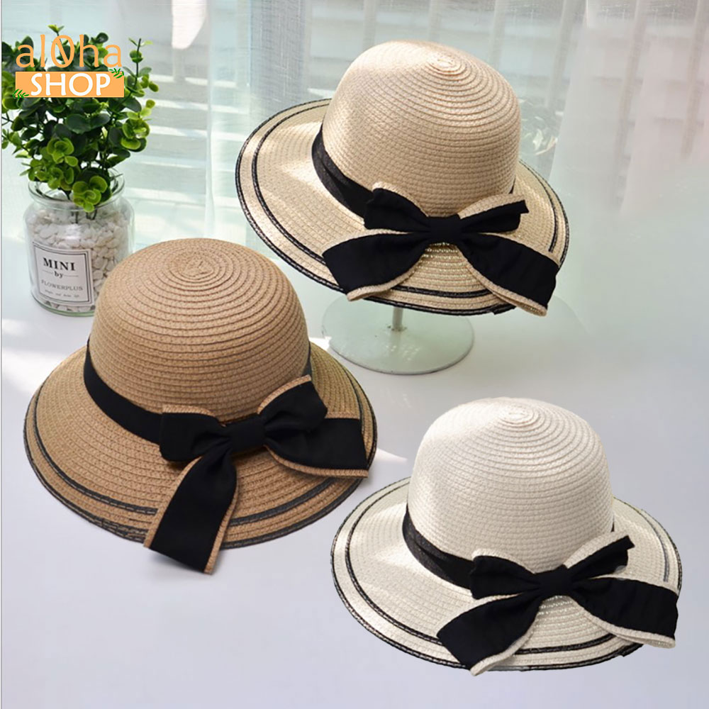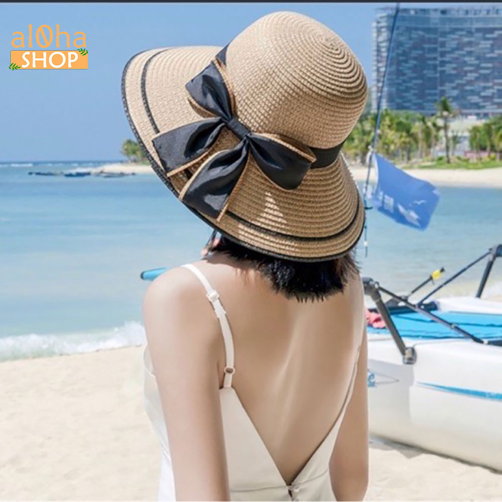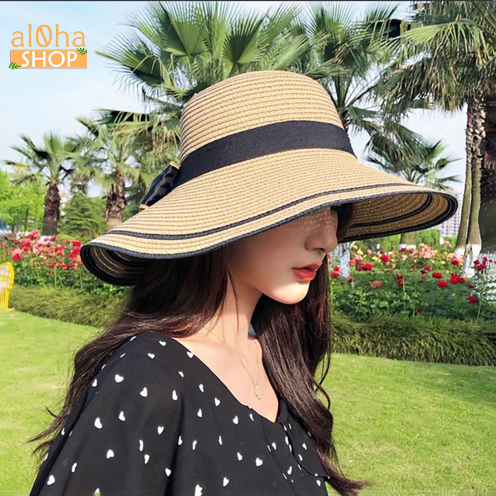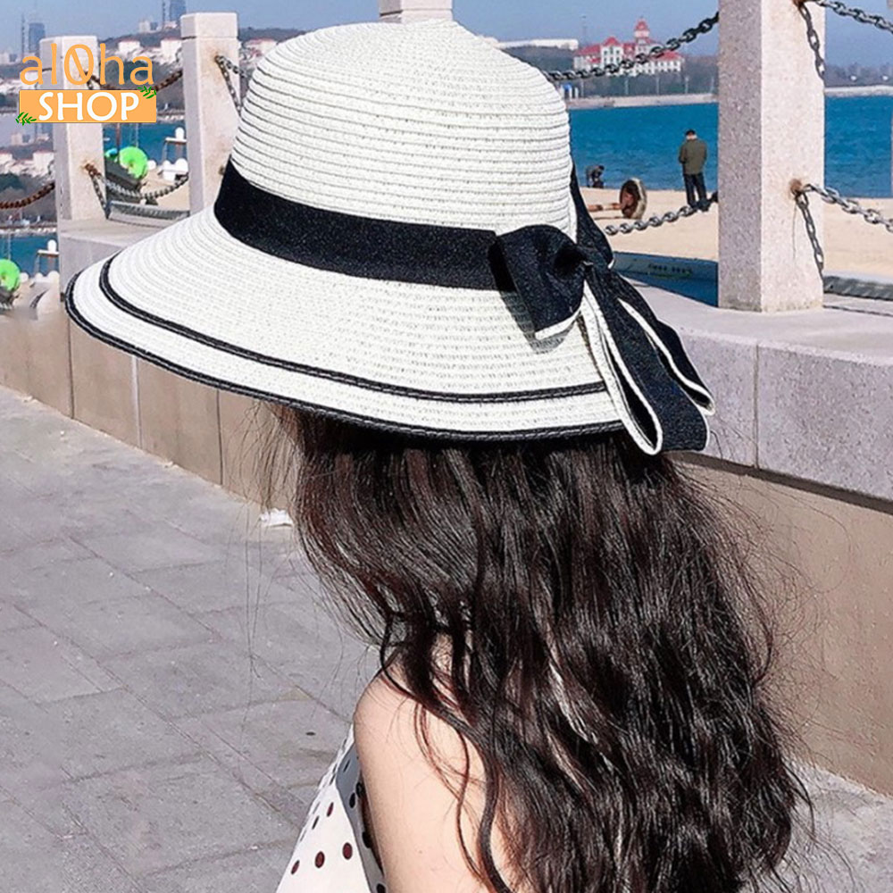 Nón cói vành rộng cụp viền đen - mũ cói mềm thắt nơ chống nắng, đi biển - al0ha Shop