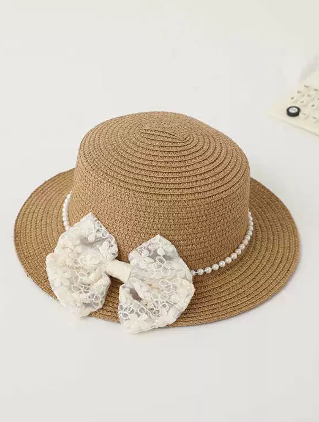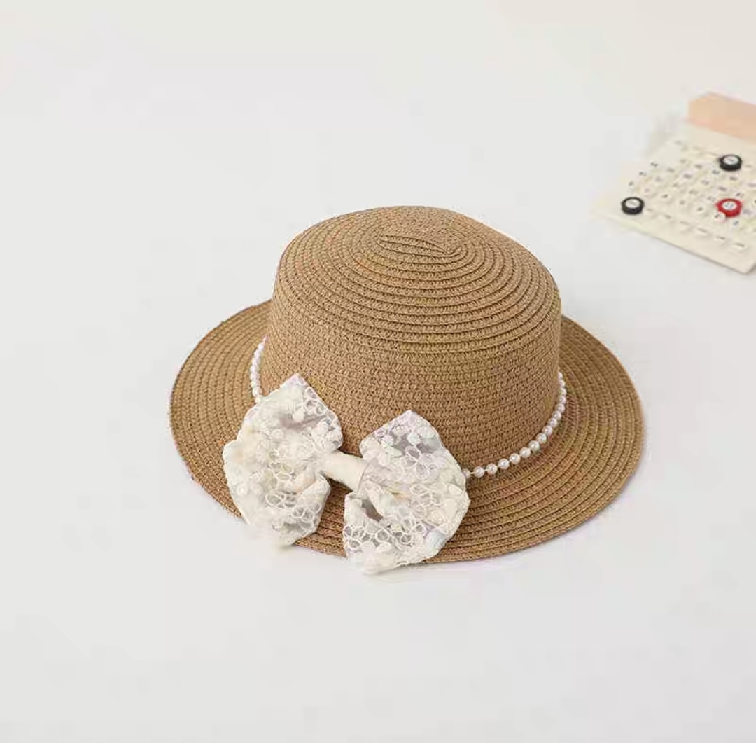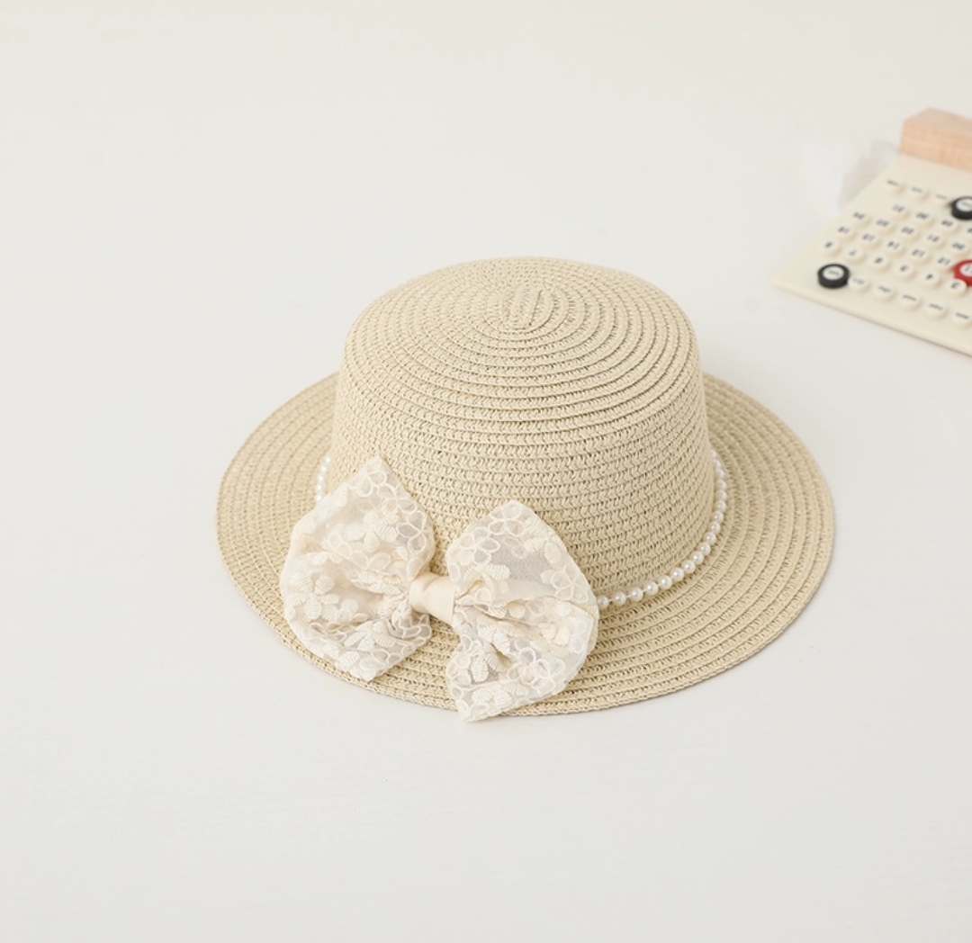 Nón mũ đi biển vành bằng phối đai ngọc trai nhân tạo nơ ren chất liệu cói chống nắng thoáng mát thời trang Hàn Quốc
