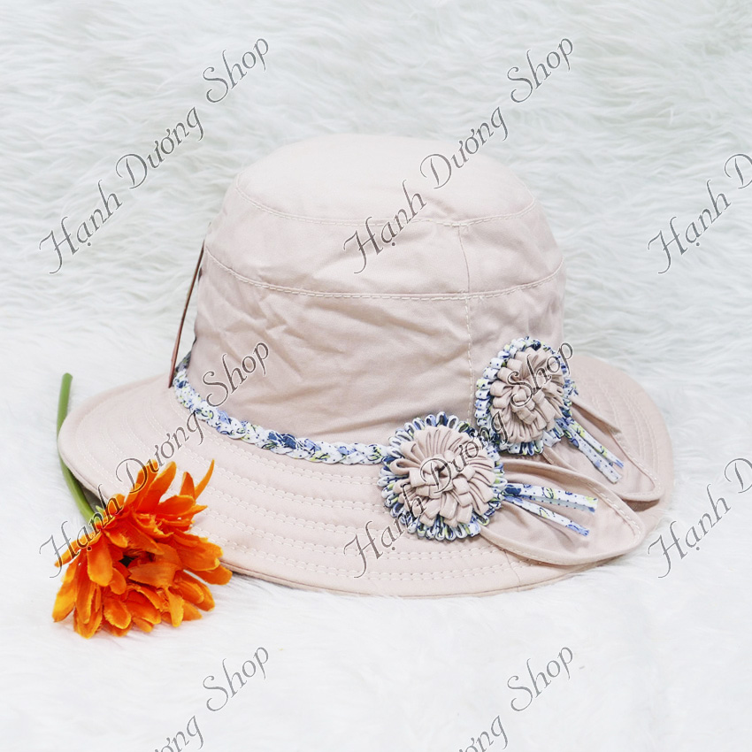 Nón rộng vành nữ gắn hoa 2 hoa vành rộng 7cm, kết tít xung quanh hoa, chất liệu vải cotton oát cao cấp - Hạnh Dương