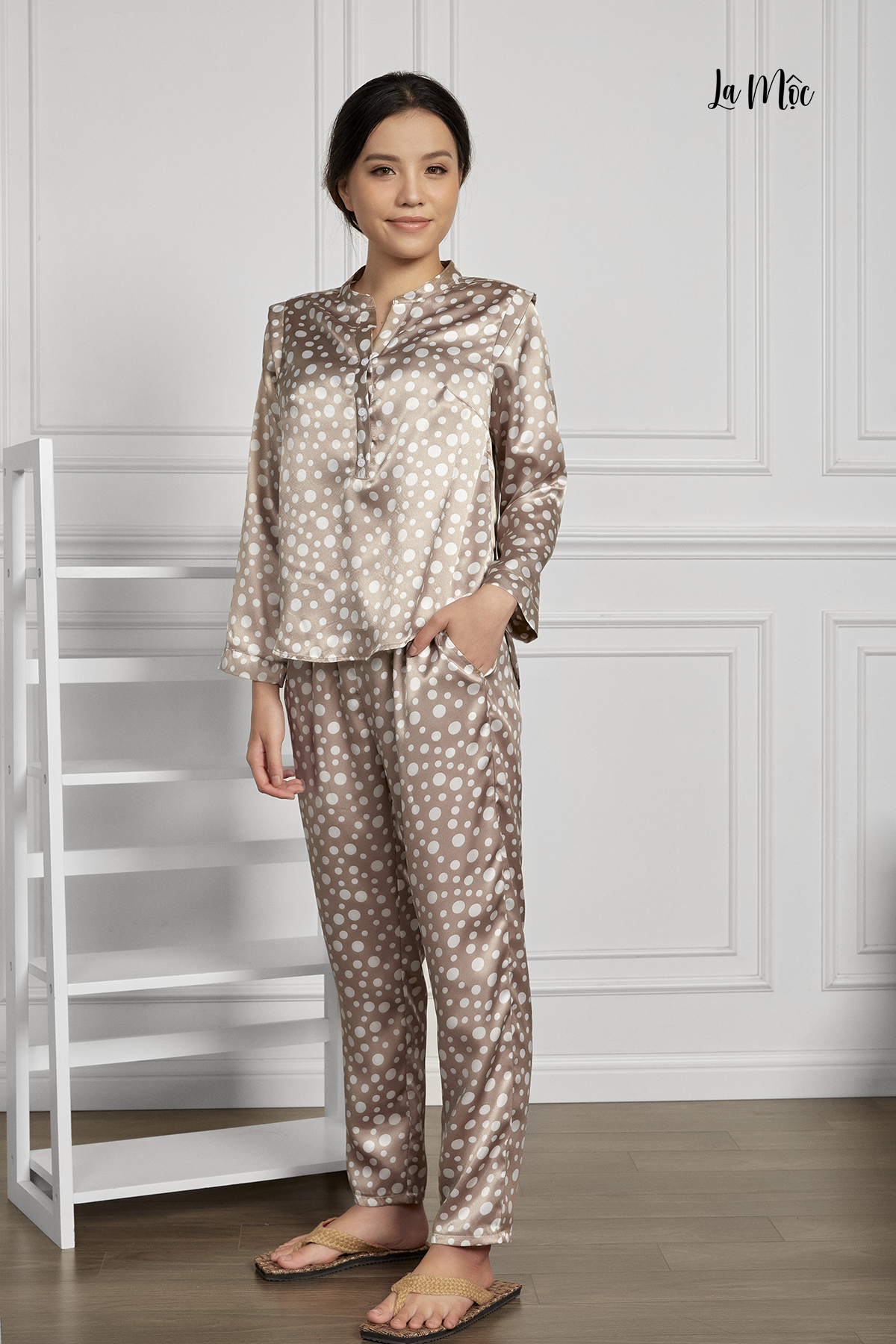 Bộ mặc nhà màu nâu nhạt họa tiết chấm bi trắng - LA MỘC chất liệu vải SATIN LỤA.