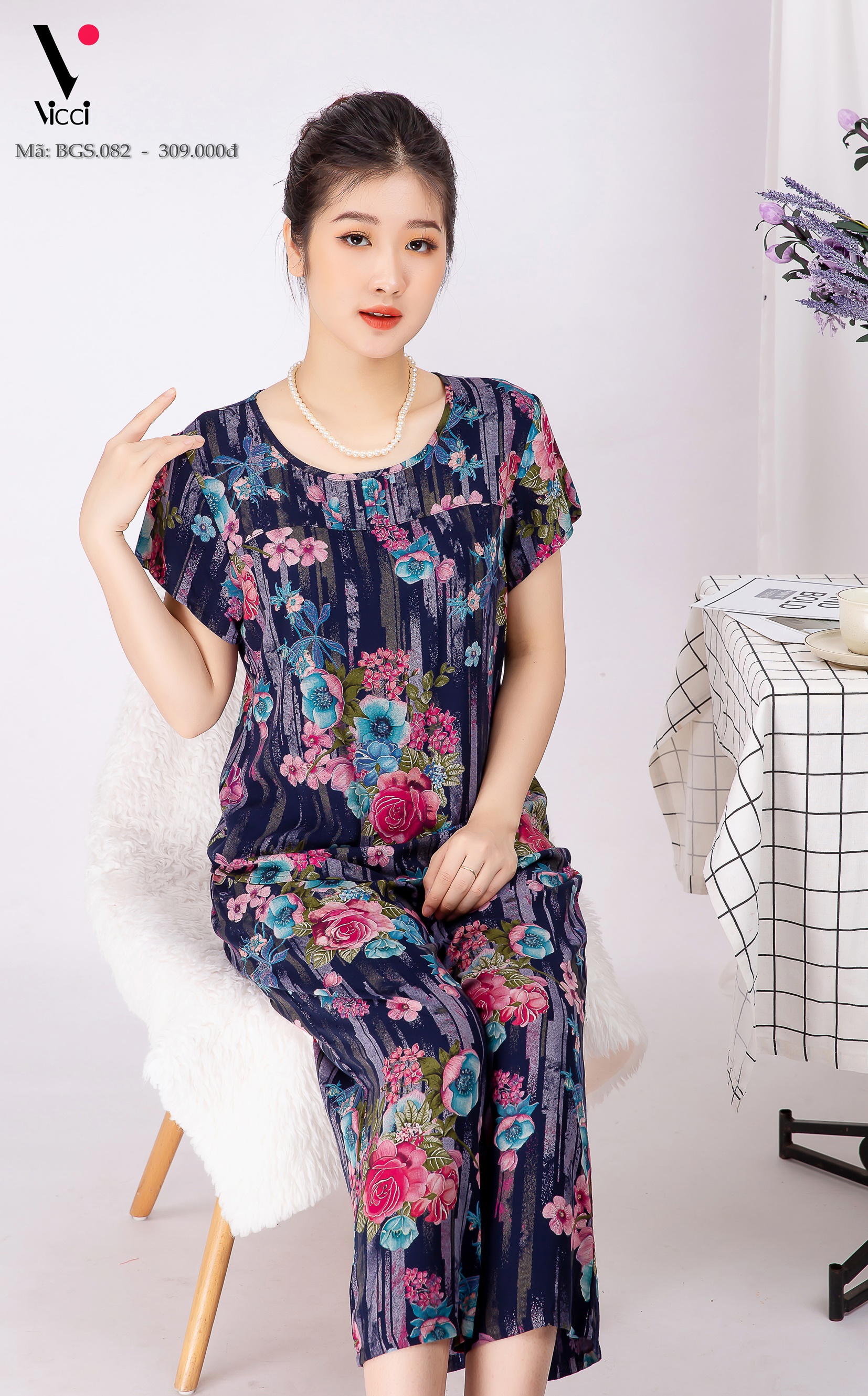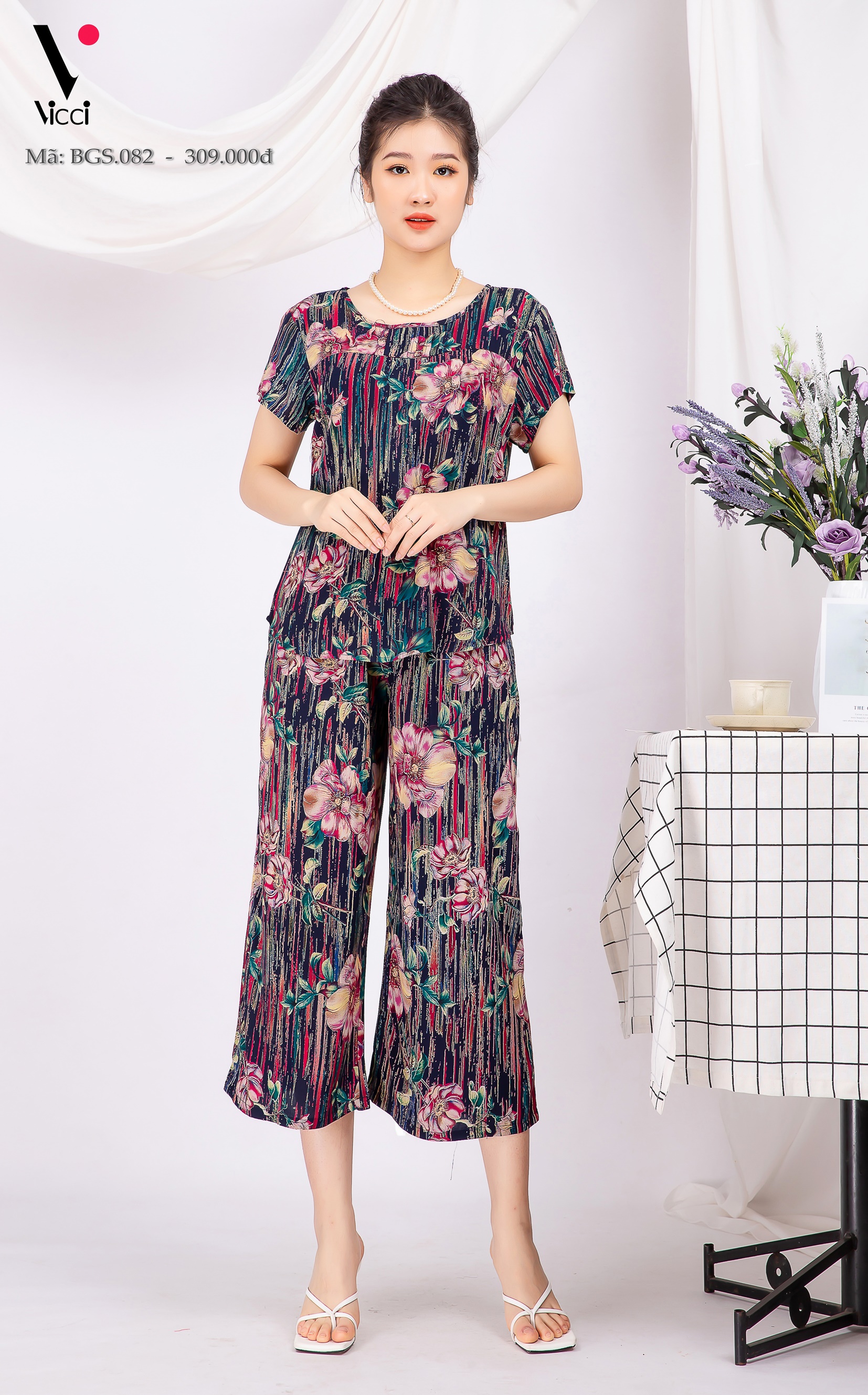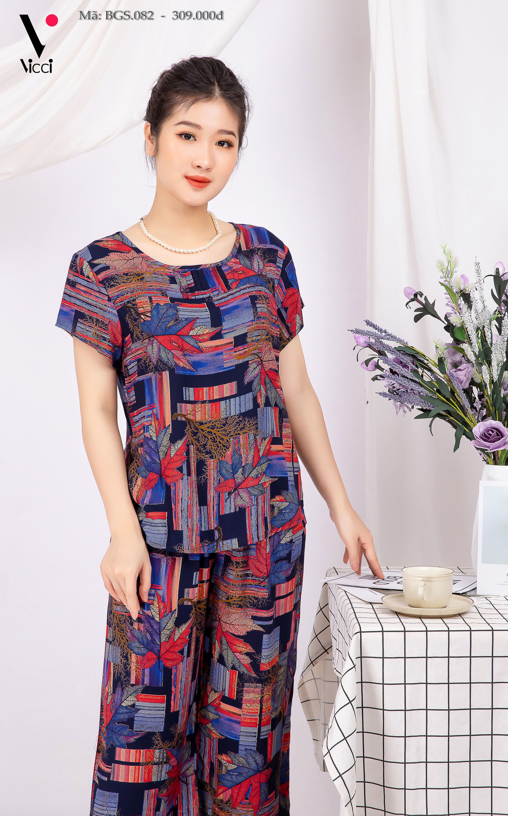 Bộ mặc nhà trung niên lanh (tole) Vicci BGS.082, áo cộc tay quần ống sớ nhiều hoạ tiết với thiết kế thanh lịch mang đến cho phái đẹp vẻ ngoài duyên dáng, đằm thắm. Form trang phục suông tạo cảm giác thoải mái khi làm việc, hoạt động ở nhà. Kiểu áo tay ngắn và quần dài phối họa tiết mới lạ, bắt mắt trên nền màu của trang phục. Sản phẩm được may từ chất vải lanh nhung mềm mịn, thoáng mát phù hợp mặc trong mùa xuân hè.