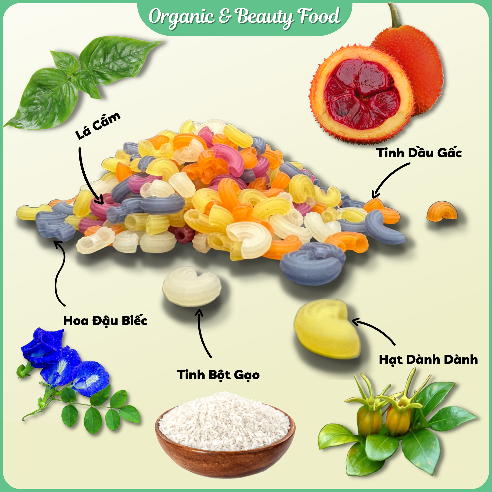 Nui gạo với thành phần 100% tự nhiên từ tinh bột gạo, tinh bột khoai mì và màu chiết suất từ tự nhiên rất an toàn.