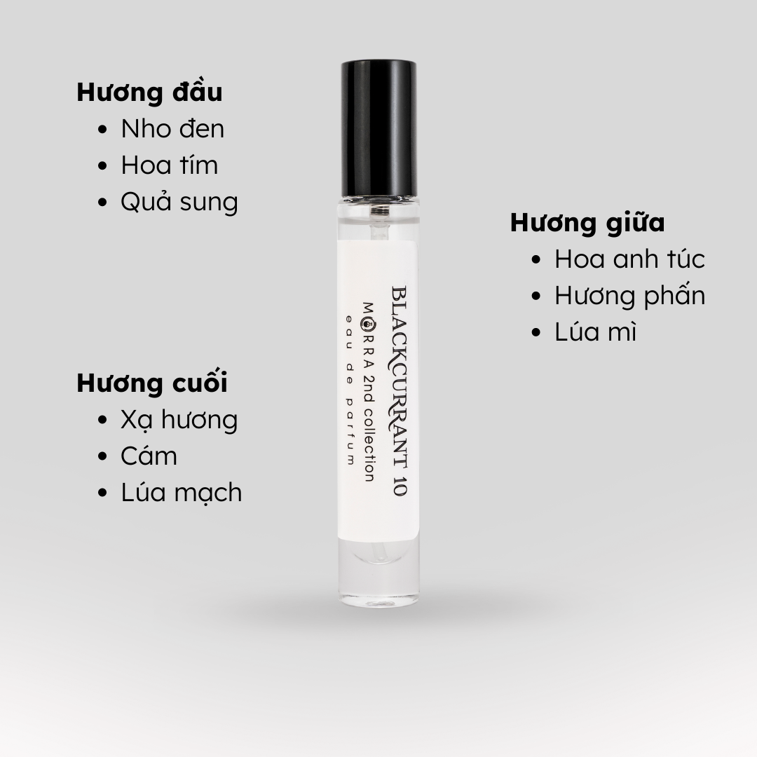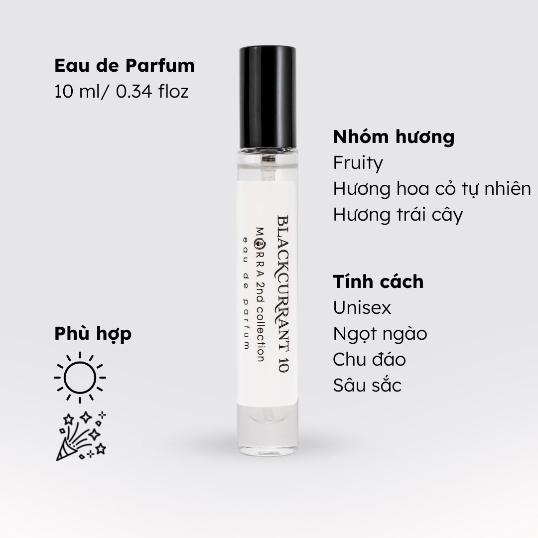 - Đối tượng sử dụng: Blackcurrant 10 phù hợp với các bạn ở độ tuổi sinh viên và cả nhân viên văn phòng. Cùng với hương thơm thanh lịch, sắc sảo và lôi cuốn với độ lưu hương cao, tỏa hương xa. Blackcurrant 10 là một sự lựa chọn hoàn hảo cho những buổi tiệc, buổi hẹn và cả những dịp thường ngày.