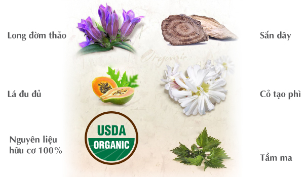 Thành phần | Long đờm thảo, sắn dây, lá đu đủ, tầm ma và cỏ tạo phì (91.7%) Chất hoạt động bề mặt (Nonion 4.8%, Anion 3.5%) |