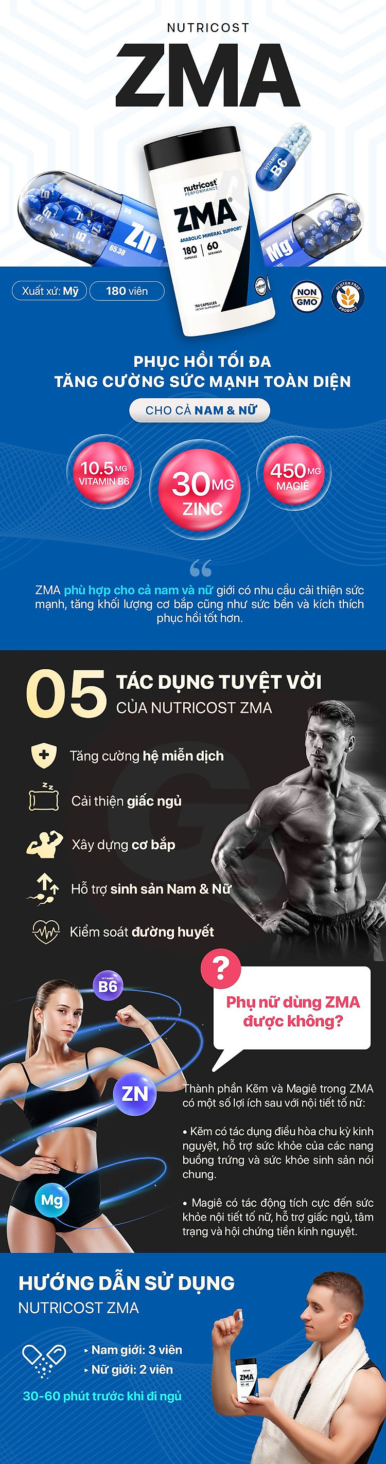 ZMA là một dạng viên uống tăng Test tự nhiên và hiệu quả, tuy nhiên nghiên cứu hiện nay đã cho thấy ZMA nữ giới cũng có thể sử dụng để cải thiện sức mạnh, kích thích tăng cơ giảm mỡ cũng như cải thiện sức bền và giúp đẩy nhanh quá trình phục hồi.
