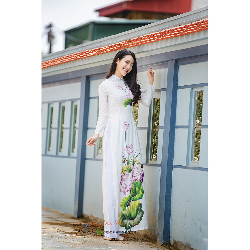Giới thiệu Bộ áo dài truyền thống họa tiết hoa sen màu trắng.