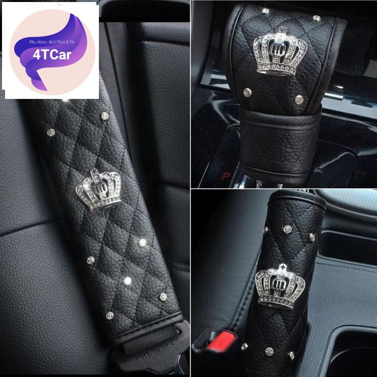 Ốp cần số -ốp phanh tay - bọc dây an toàn đính đá sang trọng - logo Vương Miện