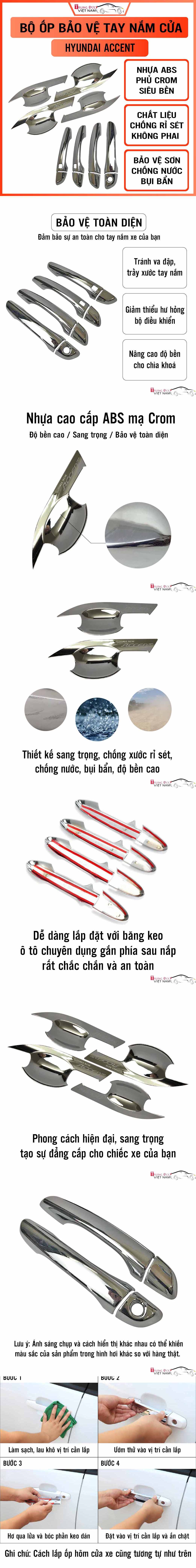 • Ốp tay hõm cửa cho dòng xe HYUNDAI ACCENT tăng tính thẩm mỹ của xe. Xe bạn sẽ nhìn sang trọng và lịch sự hơn rất nhiều với bộ ốp tay nắm cửa.