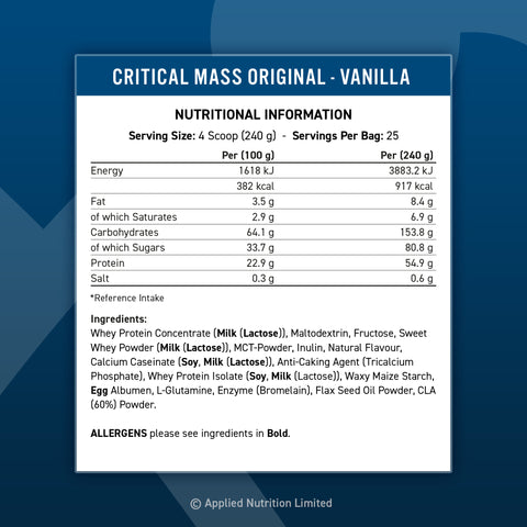 Critical Mass Original sữa dành cho người có thể trạng khó tăng cân của hãng một hãng thực phẩm bổ sung nổi tiếng của Vương Quốc Anh. Sản phẩm cung cấp nguồn calories dồi dào với hàm lượng cao protein và carbs trên mỗi lần dùng.Từ đó, bảo đảm rằng cơ bắp của người dùng cung cấp đủ các chất dinh dưỡng cần thiết để phát triển và phục hồi sau khi tập luyện.