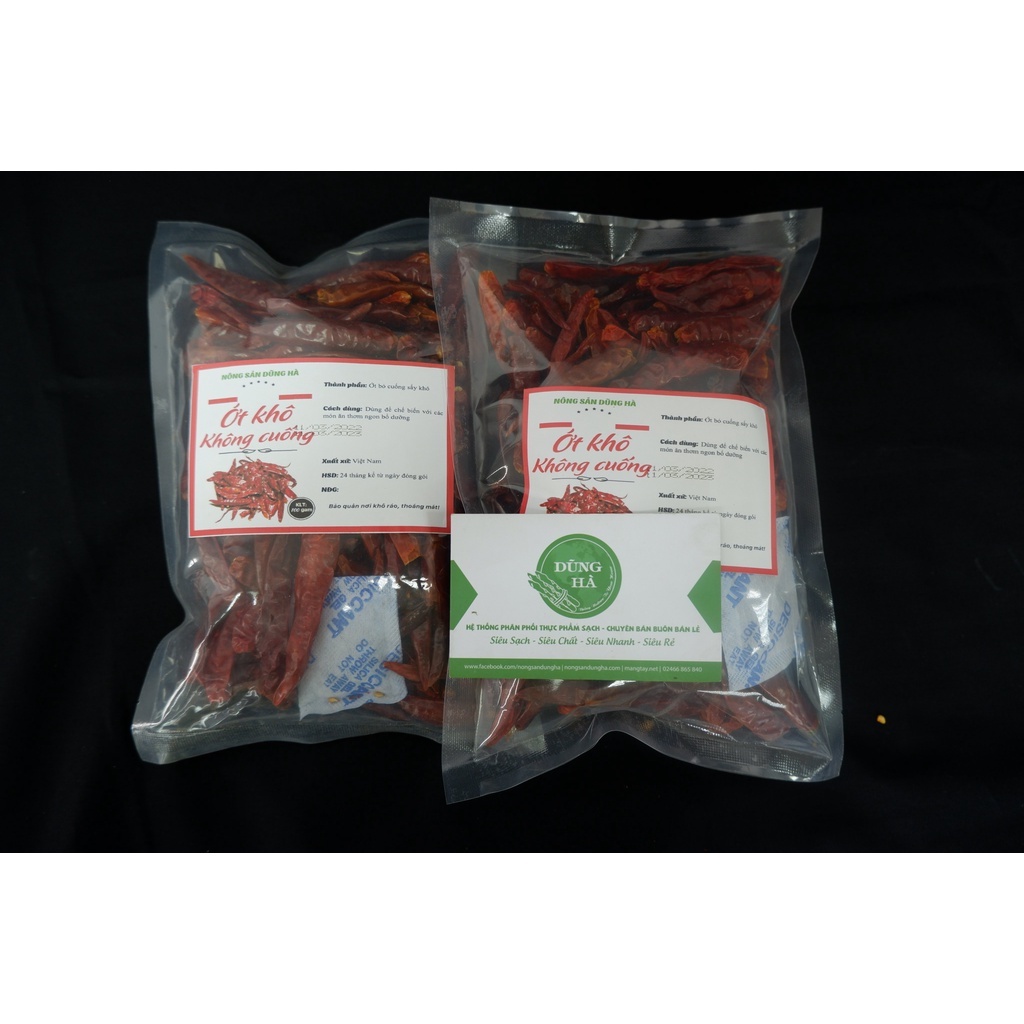 Thông tin sản phẩm ớt khô tại Dũng Hà: Phân loại: Ớt khô nguyên quả còn cuống và Ớt khô nguyên quả không cuống Đóng gói: Đóng gói 500gr. Hút chân không Thành phần: 100% ớt tươi tự nhiên sấy khô theo công nghệ dây truyền Hạn sử dụng: 6 tháng kể từ ngày sản xuất Cách sử dụng: Ớt được sử dụng làm gia vị chế biến món ăn,…. Bảo quản: Nơi thoáng mát, tránh ánh nắng trực tiếp, thoáng mát Giá bán: 75.000đ/ 500gram Giao hàng: Hỗ trợ giao hàng trên toàn quốc