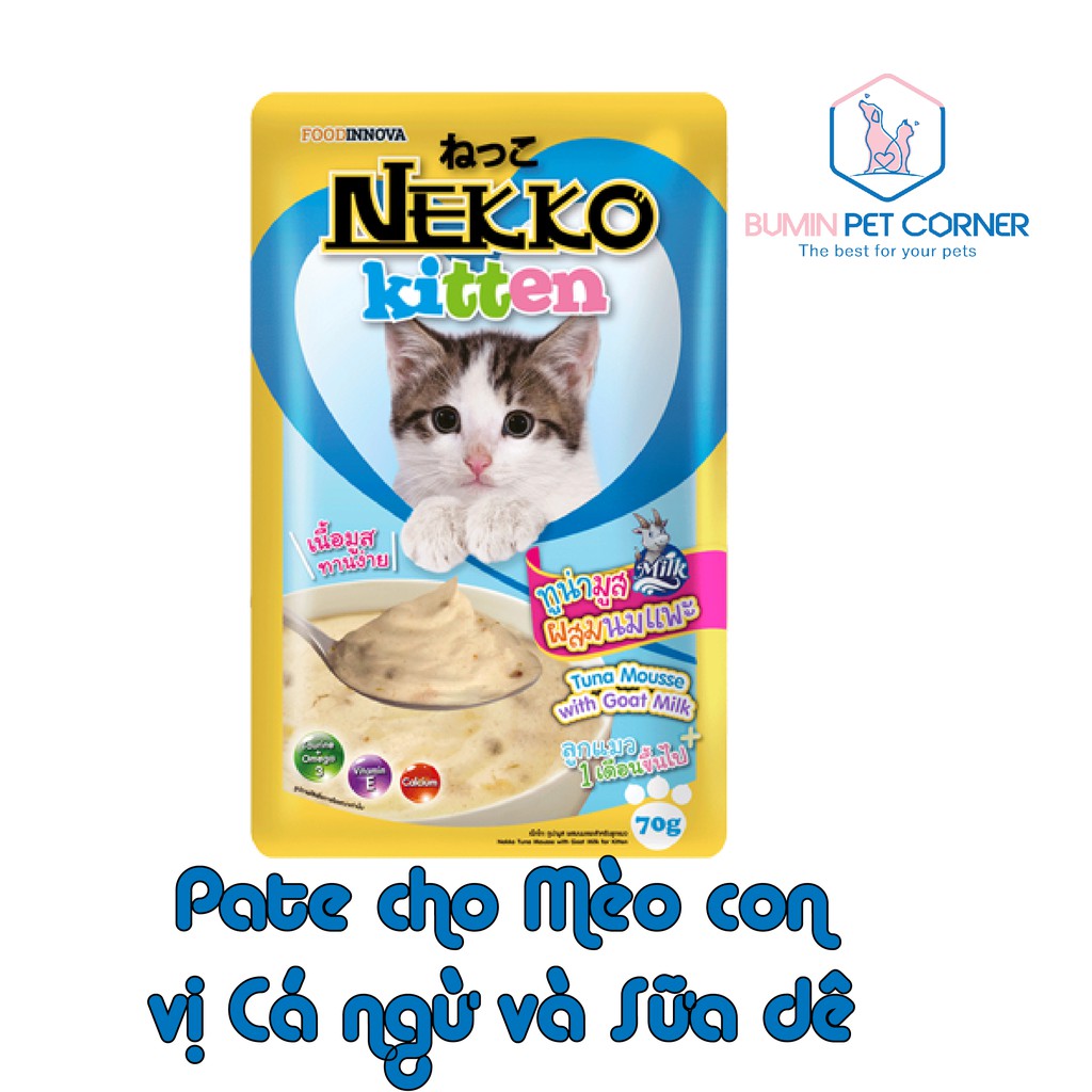 𝗡𝗘𝗞𝗞𝗢 𝗞𝗜𝗧𝗧𝗘𝗡 - 𝗣𝗮𝘁𝗲 𝗰𝗵𝗼 𝗺𝗲̀𝗼 𝗰𝗼𝗻 𝗴𝗼́𝗶 𝘅 𝟳𝟬𝗴 Nekko Kitten là pate cho mèo con dạng mousse mềm mịn, phù hợp cho các bé mèo con răng còn yếu.