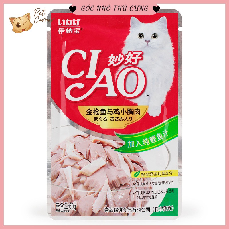 1. GIỚI THIỆU SẢN PHẨM - Pate Ciao cho mèo là một sản phẩm thức ăn ướt cho mèo của hãng INABA. Pate Ciao được chế biến từ các nguyên liệu tự nhiên tươi ngon với nguyên liệu chủ yếu là thịt cá ngừ, phù hợp với mèo ở mọi lứa tuổi với dinh dưỡng cao và mùi vị thơm ngon, quyến rũ cả những chú mèo khó tính nhất. - Không chứa chất tạo màu tổng hợp và chất bảo quản. * Công dụng của Pate Ciao: - An toàn cho hệ tiêu hóa thú cưng của bạn. - Bổ sung tinh chất trà xanh tăng sức đề kháng, hỗ trợ tiêu hóa, giúp khử mùi hôi miệng, giảm mùi chất thải. - Bổ sung Vitamin E, bảo vệ làn da và lông.