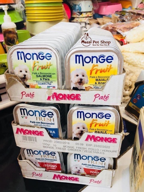- Monge là thương hiệu pate dành cho thú cưng rất được ưa chuộng tại các nước Châu Âu với hương vị thơm ngon từ những loại thịt đặc trưng như thịt gà, thịt gà tây, cá ngừ, cá hồi, vịt, cừu...Thêm vào đó, pate Monge còn được biết đến với các dòng pate kết hợp với trái cây rau củ để tăng chất xơ và dinh dưỡng cho thú nuôi như Gà tây & Việt quất, Gà & Phúc Bồn Tử, Vịt & Cam, Cừu & Táo... Ngoài ra, pate Monge cũng nổi tiếng với sự an toàn và chất lượng thực phẩm với tiêu chí: không gluten ( gây dị ứng ), không màu thực phẩm và không chất bảo quản. Pate Monge còn được bổ sung vitamin A, D3 và E nhằm kích thích khẩu vị ăn của chó, giúp chó bạn tăng cân, nuôi dưỡng bộ lông và da dẻ hồng hào.
