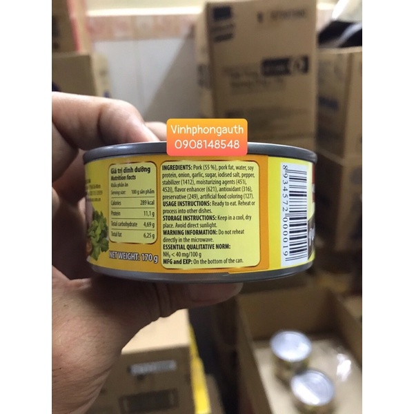 Pate Thịt Heo Vissan hộp 170gr 👉Patê thịt heo 👉Quy cách đóng gói: 170g/hộp. 👉 Thành phần: Nạc heo (55%), mỡ heo, nước, protein đậu nành, hành, tỏi, đường, muối i-ốt, tiêu, chất ổn định (1412), chất giữ ẩm (451i, 452i), chất điều vị (621), chất chống oxy hóa (316), chất bảo quản (249), phẩm màu tổng hợp (127). 👉 Hướng dẫn sử dụng: Dùng ngay, có thể làm nóng lại trước khi dùng hoặc chế biến thành các món ăn khác. 👉 Hướng dẫn bảo quản: Nơi thoáng mát, không để nơi nóng, ẩm. 👉Hạn sử dụng : 3 năm. 👉Sản phẩm được đóng gói nhỏ, hợp vệ sinh, đảm bảo an toàn chất lượng cho người tiêu dùng. 👉Được các nhà hàng quán ăn và mọi gia đình tin dùng 👉Giá hợp túi tiền rất tiết kiệm 👉Shop chuyên cung cấp các loại gia vị 👉Giao hàng toàn quốc 👉Cần mua số lượng lớn hãy nhanh tay liên hệ 📞📞📞 0908148548📞📞📞