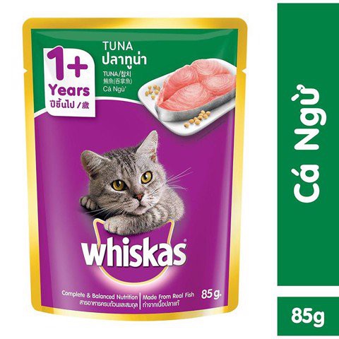 hức ăn gói pate Whiskas đủ vị 80g 1. Thức ăn gói pate Whiskas Tuna vị cá ngừ 80g 2. Thức ăn gói pate Whiskas Ocean Fish vị cá Biển 80g 3. Thức ăn gói pate Whiskas Kembung vị cá Thu 80g 4. Thức ăn gói pate Whiskas Kembung & Salmon vị cá Thu và cá hồi 80g 5. Thức ăn gói pate Whiskas Ayam & Tuna vị Gà và cá ngừ 80g PATE WHISKAS CHO MÈO Cũng giống như các loại vật nuôi khác, mèo ăn thức ăn hạt khô mãi cũng chán! Bạn nên đổi bữa cho mèo. xin giới thiệu với các SEN loại thức ăn ướt cho mèo đảm bảo dưỡng chất phát triển và cực kì an toàn. Đó là Pate cho mèo loại WHISKAS. Cách dùng rất đơn giản, các SEN có thể đun nóng pate rồi để nguội cho mèo ăn trực tiếp hoặc trộn với cơm đều được. Đặc biệt PATE WHISKAS rất phù hợp cho mèo con ăn. PATE WHISKAS CHO MÈO được đóng gói kín nên dễ dàng vận chuyển và bảo quản, có đầy đủ các vị cho mèo ăn như: pate vị cá ngừ, cá biển, gà – cá ngừ, cá thu, cá thu – cá hồi. Các SEN tha hồ lựa chọn loại pate phù hợp cho BOSS nhà mình nhé THÀNH PHẦN DINH DƯỠNG CỦA PATE CHO MÈO Mỗi loại pate whiskas cho mèo có các vị khác nhau nhưng tỉ lệ dinh dưỡng trong pate như sau: – Độ đạm: tối thiểu 7% – Độ béo: tối thiểu 2% – Chất xơ: tối thiểu 1% – Độ ẩm: 83% Hướng Dẫn Sử Dụng : sử dụng ngay. Bảo quản phần thức ăn chưa sử dụng hết trong tủ lạnh không quá 3 ngày. Khi sử dụng, hâm nóng thức ăn rồi để nguội. - Kích Cỡ/ Thể Tích : 80g - Nhà Sản Xuất : Whiskas Thông tin thương hiệu Whiskas (trước đây gọi là Kal Kan) là một thương hiệu của thức ăn cho mèo được bán trên khắp thế giới. Nó thuộc sở hữu tập đoàn Mỹ Mars. Incorporated. Sản phẩm bao gồm thức ăn sẵn, hoặc như thịt đóng hộp, túi, hoặc bánh quy khô. Hầu hết các bao bì có một màu tím dễ dàng nhận biết. Whiskas ban đầu được gọi là Kal Kan khi nó bắt đầu vào năm 1936. Năm 1988, công ty đổi tên thành Whiskas để thúc đẩy chính mảng thức ăn cho mèo trên quốc tế