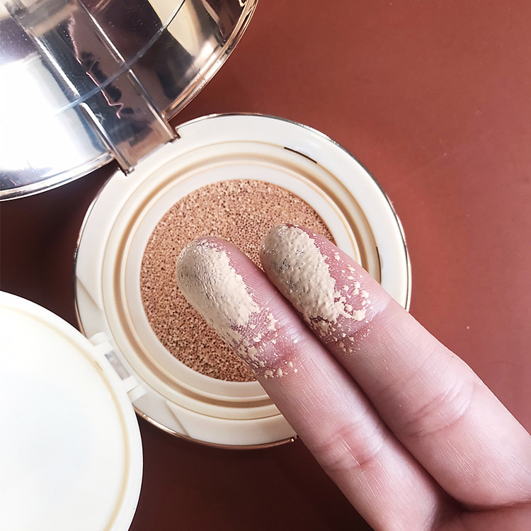 - Dùng mút tán ấn vào khay Cushion để lấy phấn nước. Tán đều lên bề mặt da, che phủ kỹ vùng quầng thâm dưới mắt, khóe môi và hai cánh mũi.