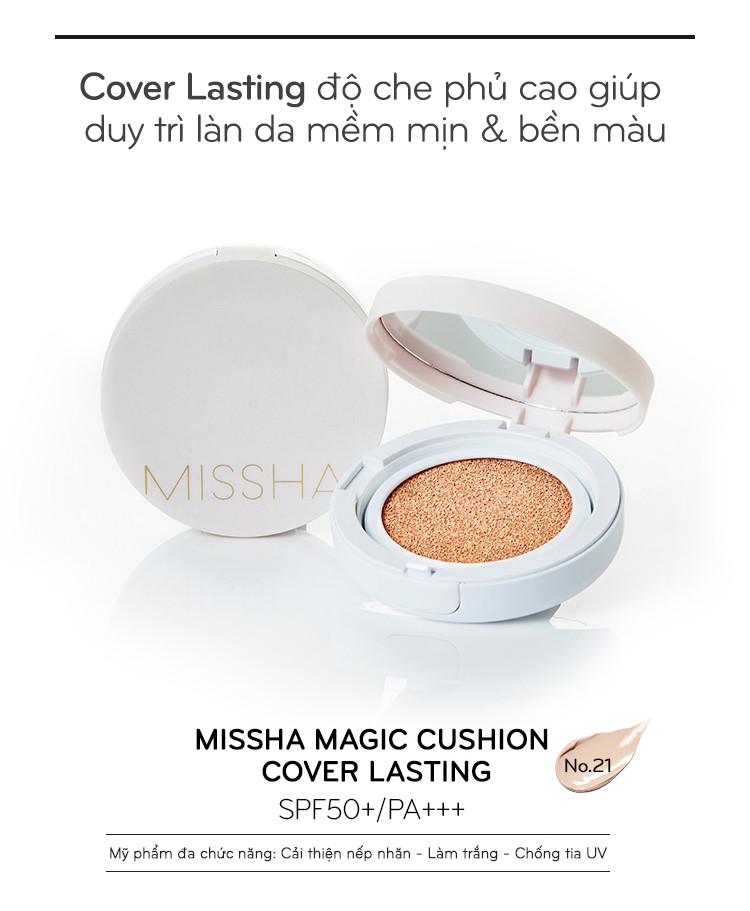❖ Phấn nước Misa Magic Cushion Cover Lasting SPF50+/PA+++ (Hồng) Với khả năng che phủ cực tốt trên da, cùng khả năng kiềm dầu hiệu quả, đây là sản phẩm rất thích hợp cho những làn da dầu hoặc có khuyết điểm nhưng ngại chồng nhiều lớp kem che khuyết điểm. Độ bền màu cũng là một điểm cộng đáng được nói đến với hơn 6 tiếng giữ trên da mặt giúp bạn tự tin xinh đẹp cả ngày dài. Đây là một ưu điểm hiếm dòng cushion nào có được bởi đặc tính của cushion là mỏng nhẹ trên da , tươi mát sẽ đem lại cho bạn một làn da tươi sáng rạng rỡ chỉ với một lượng kem nhỏ, ngăn ngừa tình trạng da bóng dầu.