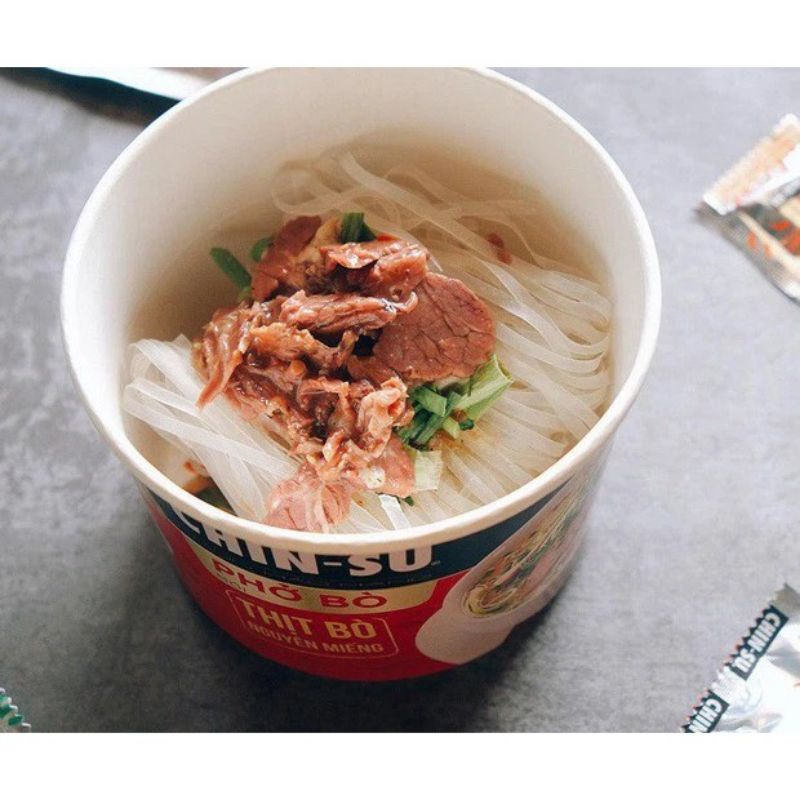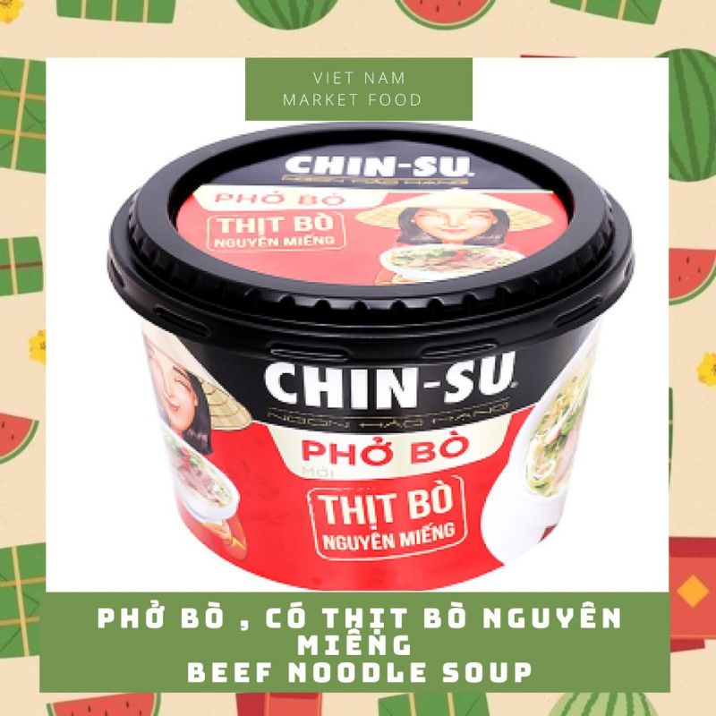 Phở bò Chinsu hộp 132g (có gói thịt bò thật) giá rẻ, đảm bảo hàng chính hãng, Vị Bò Loại Phở nước Sợi phở To, mềm Khối lượng 132g Thành phần VẮT PHỞ - Gạo, tinh bột khoai mì, chất ổn định (466), muối, chất điều vị (621). SÚP - Thịt bò 364 g/kg, nước, đường, dầu thực vật, chất điều vị (621, 635), muối, hỗn hợp gia vị và thảo mộc, tương ớt, nước cốt bò 11,8 g/kg, hành tây, nước cốt phở bò 8,4 g/kg, chất làm dầy (1414), gừng, dịch chiết thịt bò 5,3 g/kg, húng quế, bột thịt gà, hành lá sấy, hương liệu giống tự nhiên, tổng hợp, tự nhiên, ớt sấy, quế cây, hoa hồi, thảo quả khô, chất bảo quản (211), chất chống oxy hoá (320, 321). Cách nấu Mở nắp tô, xé và cho vắt phở, các gói gia vị và gói thịt (đã được làm chín) vào tô. Đổ vào 400 ml nước sôi. Đậy nắp và đợi trong 5 phút. Trộn đều và thưởng thức. Bảo quản Để nơi khô ráo, thoáng mát, tránh ánh nắng mặt trời. Nên pha chế ngay sau khi mở bao bì. Tránh dể gần hóa chất hoặc sản phẩm có mùi mạnh Thương hiệu Chinsu (Việt Nam) Sản xuất tại Việt Nam