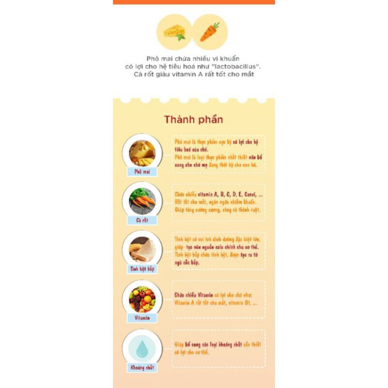 - Bổ sung dinh dưỡng, giúp thú cưng hạnh phúc và dễ huấn luyện hơn Phô mai chứa nhiều vi khuẩn có lợi cho hệ tiêu hóa như “lactobacillus”, lợi sữa cho chó mẹ đang thời kỳ cho con bú. Cà rốt giàu vitamin A rất tốt cho mắt. Tinh bột có vai trò dinh dưỡng đặc biệt lớn, bổ sung calo cho cơ thể tăng cường sinh lực, hỗ trợ quá trình học hỏi và luyện tập của các chú chó.