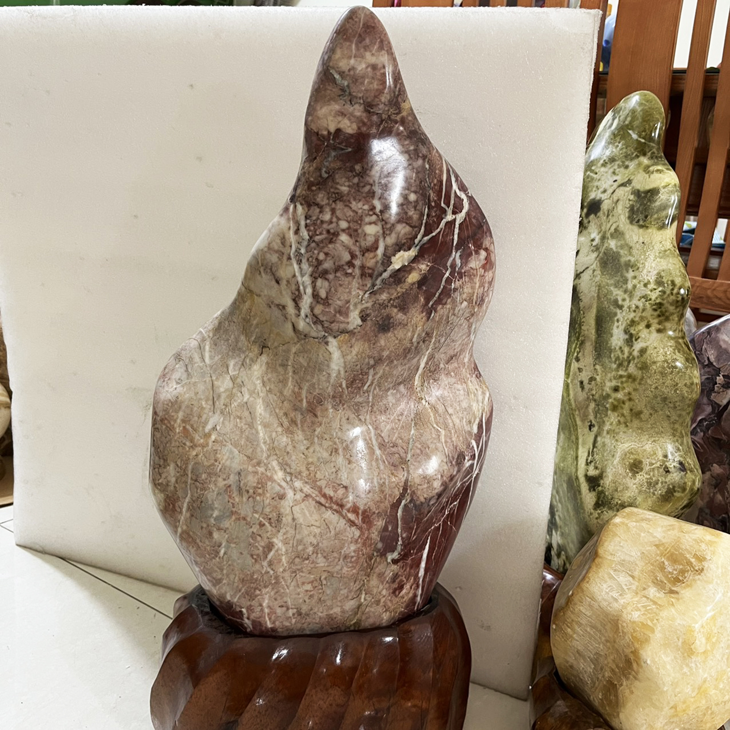 2. Chất đá và màu sắc: Đá canxite nguyên tảng màu hồng đỏ vân. Đá canxite thật nguyên khối (gỗ hóa thạch đỏ)