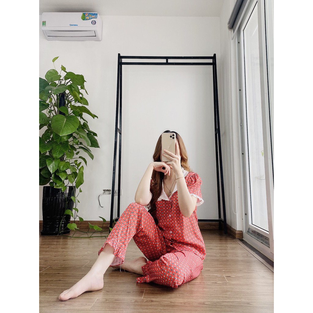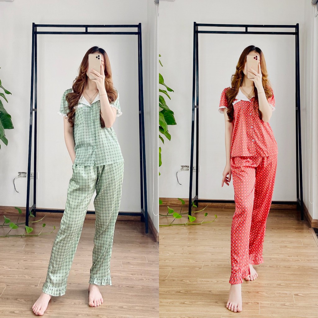 Giới thiệu Bộ Pijama lụa giấy NOHK cao cấp mặc nhà cộc tay quần dài họa tiết tay bồng