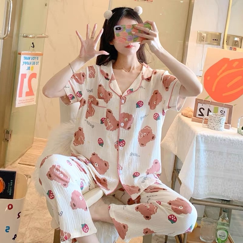 Bộ đồ ngủ pijama nữ cộc tay quần dài chất lụa Kate Thái mềm mịn màu trắng ngà hình gấu và dâu - CD0059