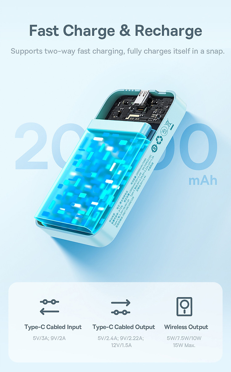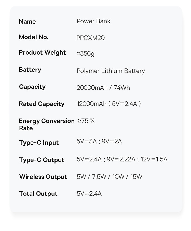 | Type-C Output | 5V-2.4A, 9V-2.22A, 12V-1.5A |
