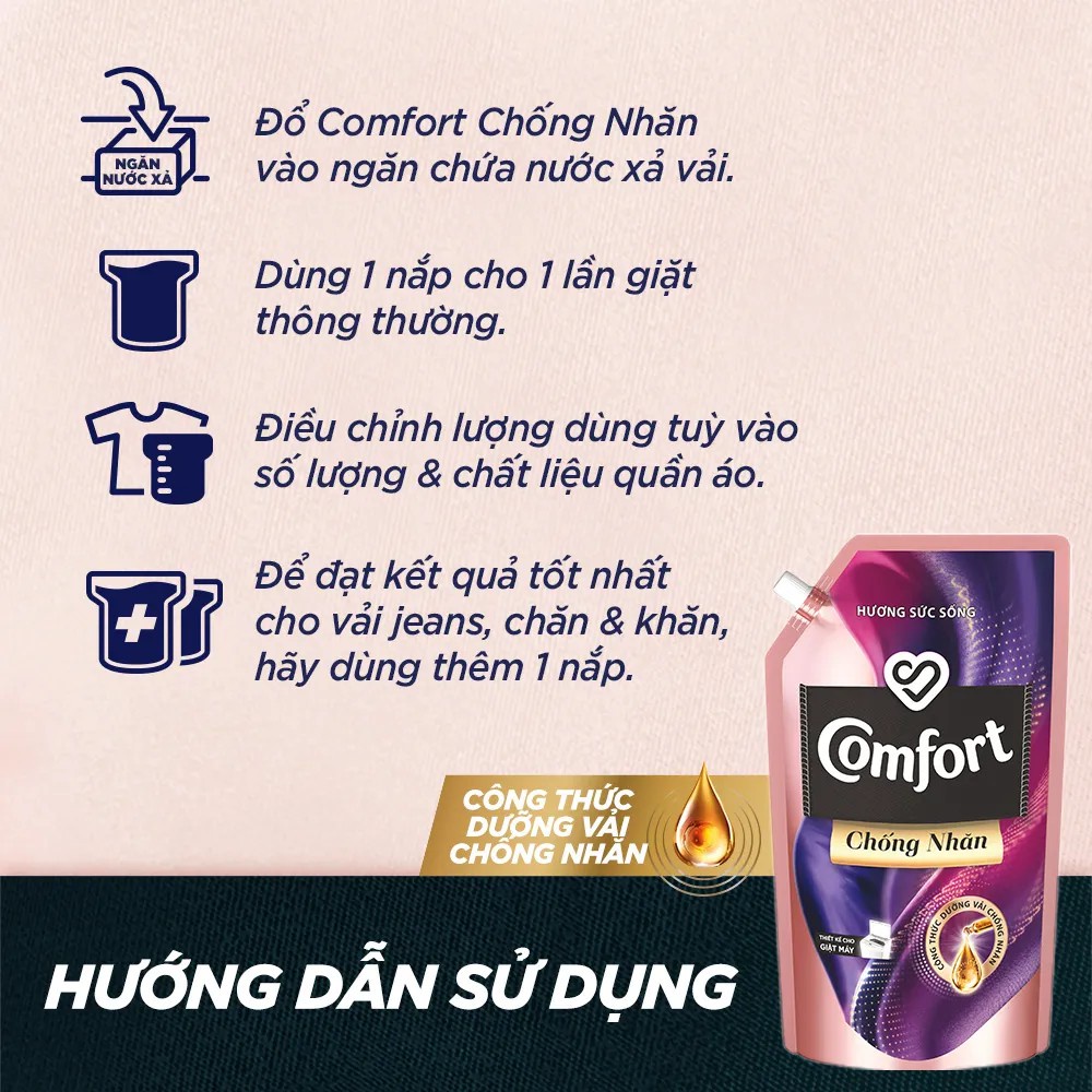RA MẮT NƯỚC XẢ VẢI CHUYÊN DÙNG ĐẦU TIÊN CHO GIẶT MÁY - COMFORT CHỐNG NHĂN HƯƠNG SỨC SỐNG Nước xả làm mềm vải Comfort Chống Nhăn mới chuyên dùng cho áo quần giặt máy. Với công thức dưỡng vải chống nhăn ưu việt, nước xả vải Comfort mới bảo vệ từng sợi vải dưới tác động quay của lồng giặt, giúp làm giảm vết nhăn gây ra bởi máy giặt vượt trội. Áo quần trở nên dễ ủi/là và lưu hương lôi cuốn dài lâu.