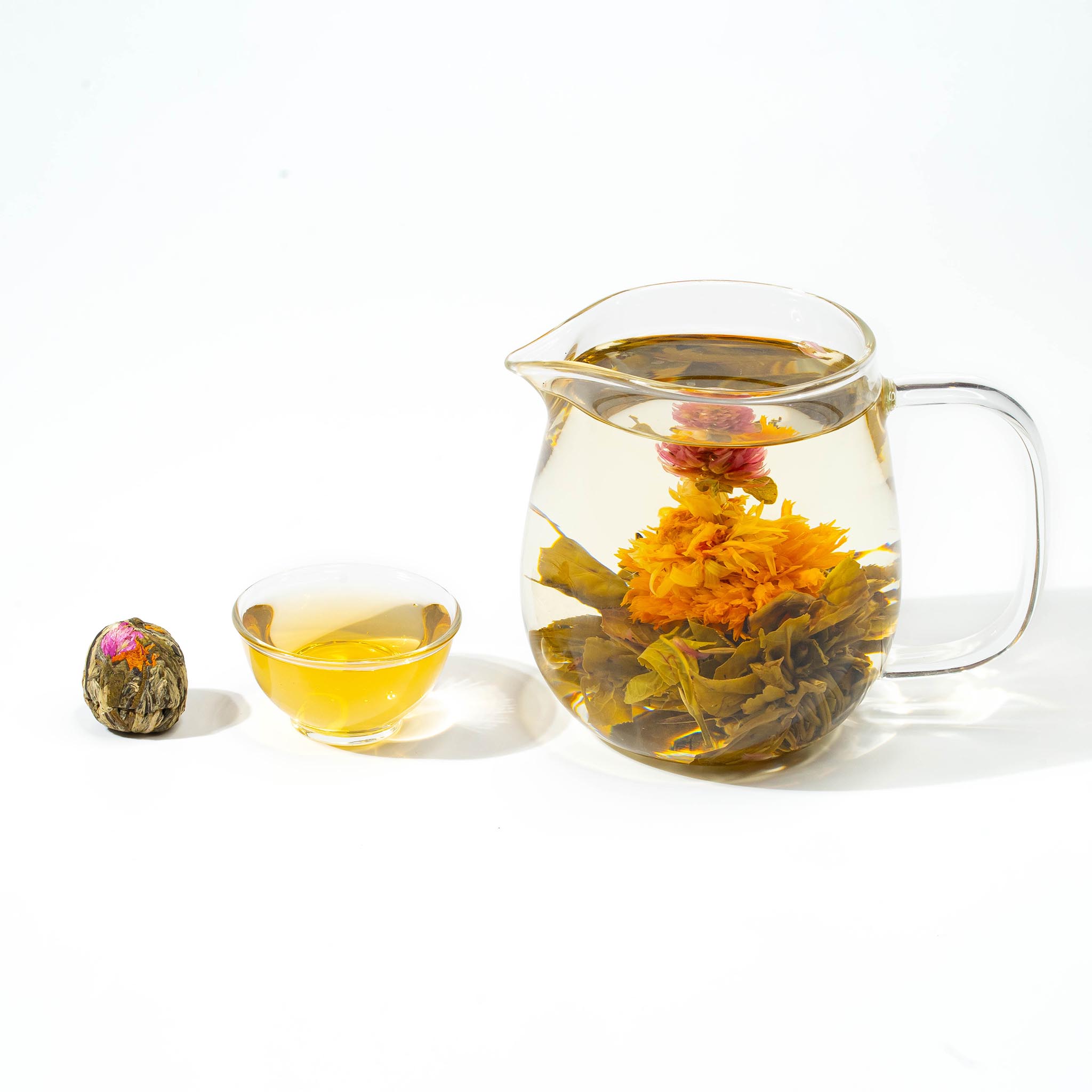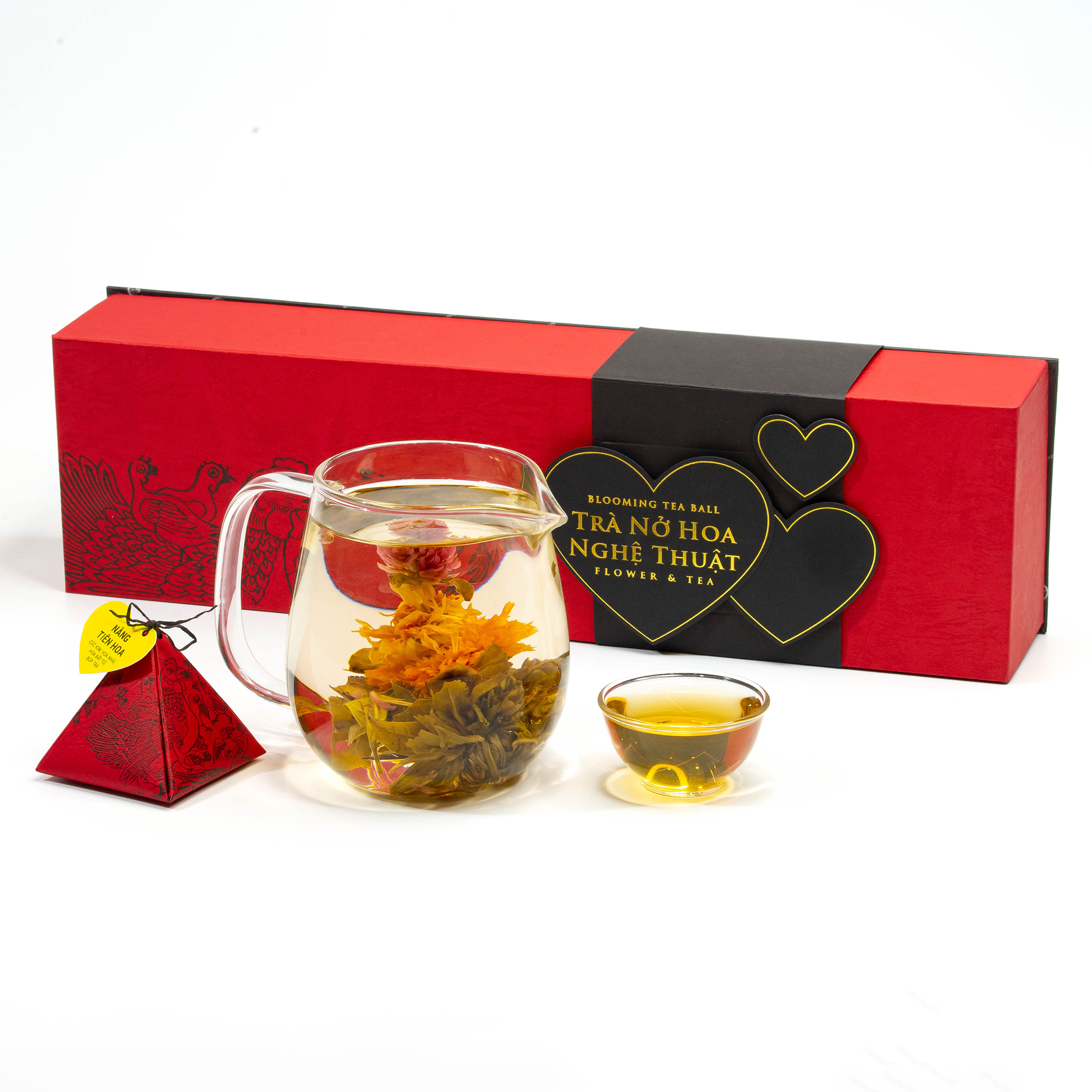 Thành phần | Hộp trà nở hoa nghệ thuật bao gồm 5 loại trà:- Nàng Tiên Hoa: hoa lài, hoa bất tử, kim cúc, búp trà.- Long Châu Tiên Nữ: hoa bất tử, hoàng cúc, búp trà.- Sắc Màu Tình Yêu: hoa lài, hoa bất tử, hoa cúc, búp trà.- Sắc Thu: hoa lài, hoa ly, búp trà.- Uyên Ương Hồ Điệp: hoa lài, hoa ly, hoa cúc, búp trà. |