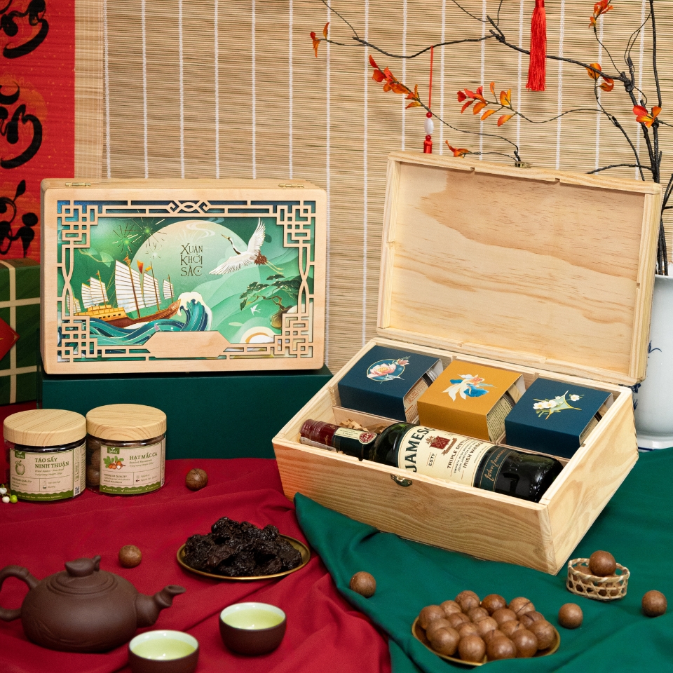 Hộp quà tết "Xuân Đại Lộc" là phiên bản đặc biệt của BST Tết 2024, bộ hộp gỗ được gia công cắt CNC tỉ mỉ với 4 lớp vô cùng tinh tế kết hợp thiết kế cá chép, hoa sen & chim én được in nhủ kim nổi, biểu tượng của phú quý vinh hoa, như một lời chúc mừng cho 1 năm mới thật nhiều may mắn và thành công.