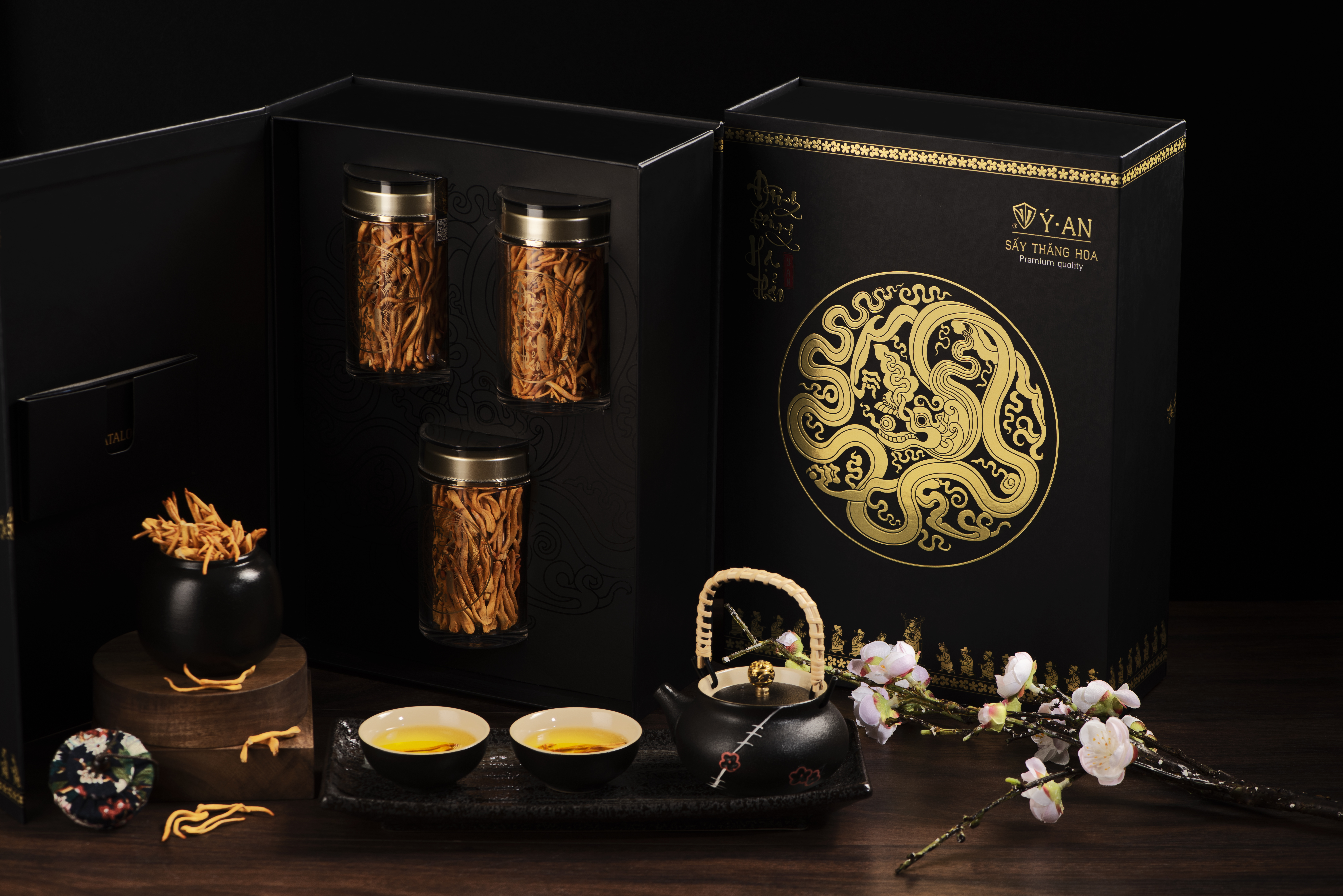 Hộp quà tặng cao cấp với set 3 lọ Đông Trùng Hạ Thảo sấy thăng hoa, với hộp đựng chất liệu Ivory đẳng cấp và sang trọng.