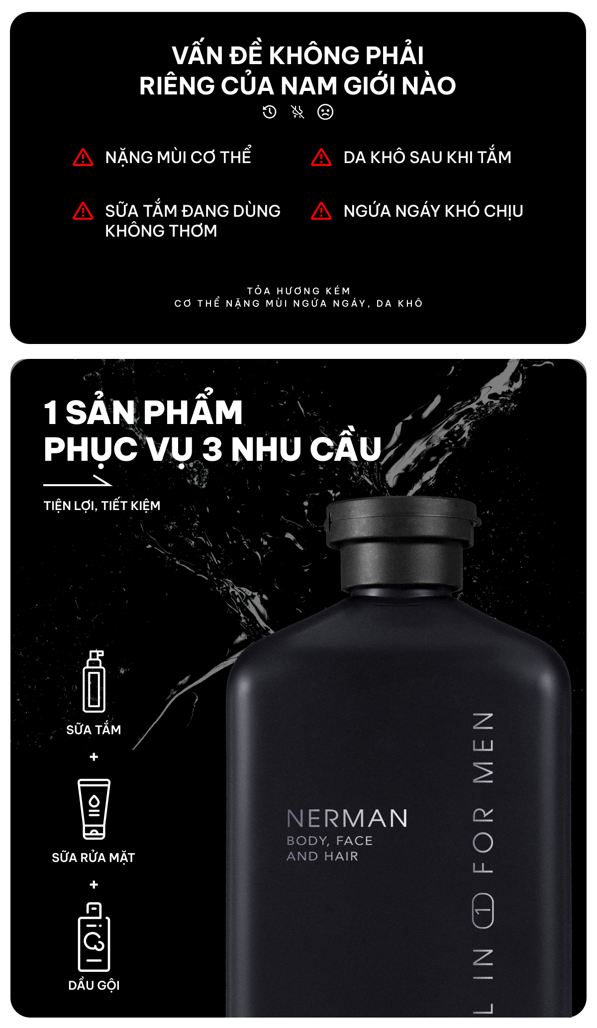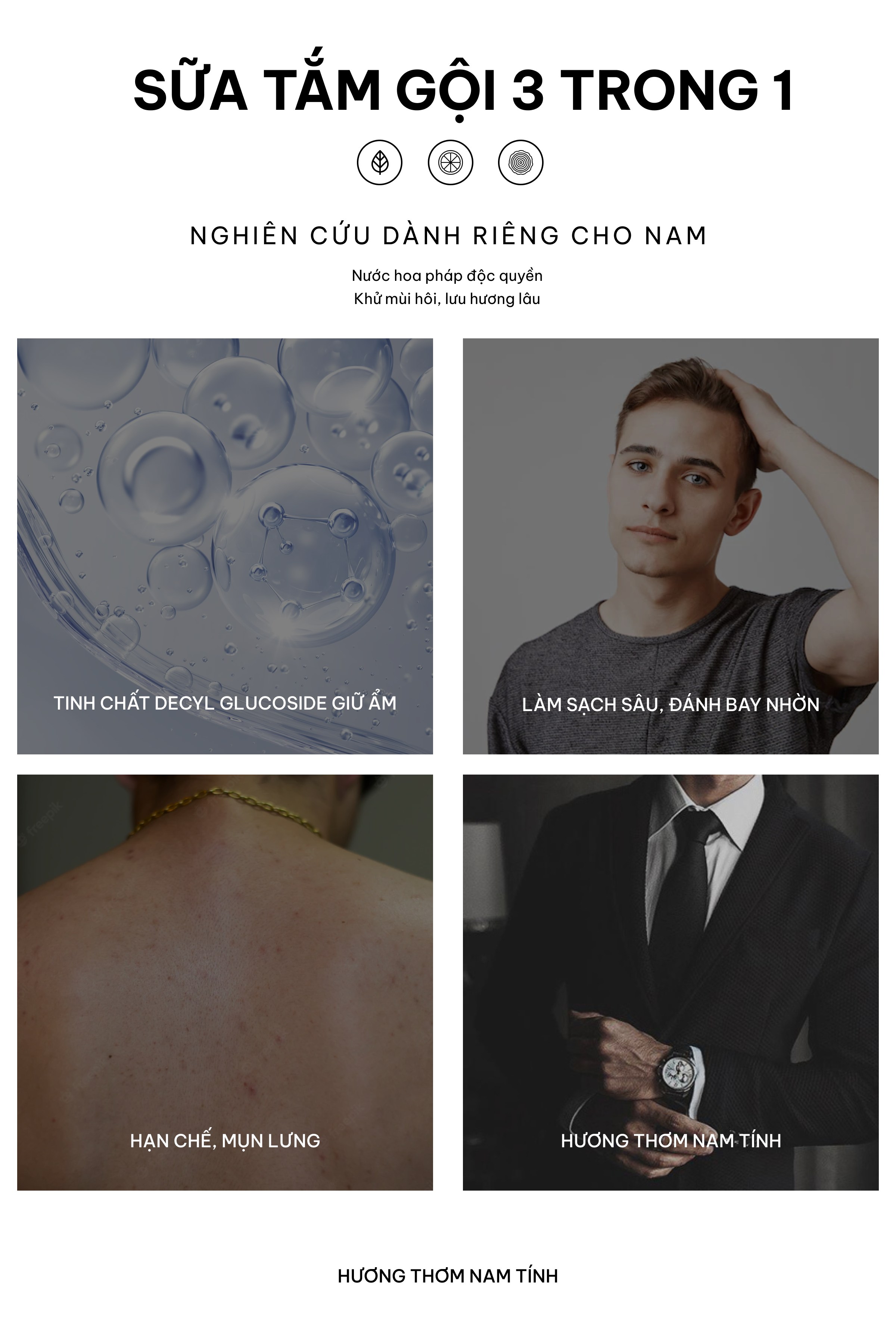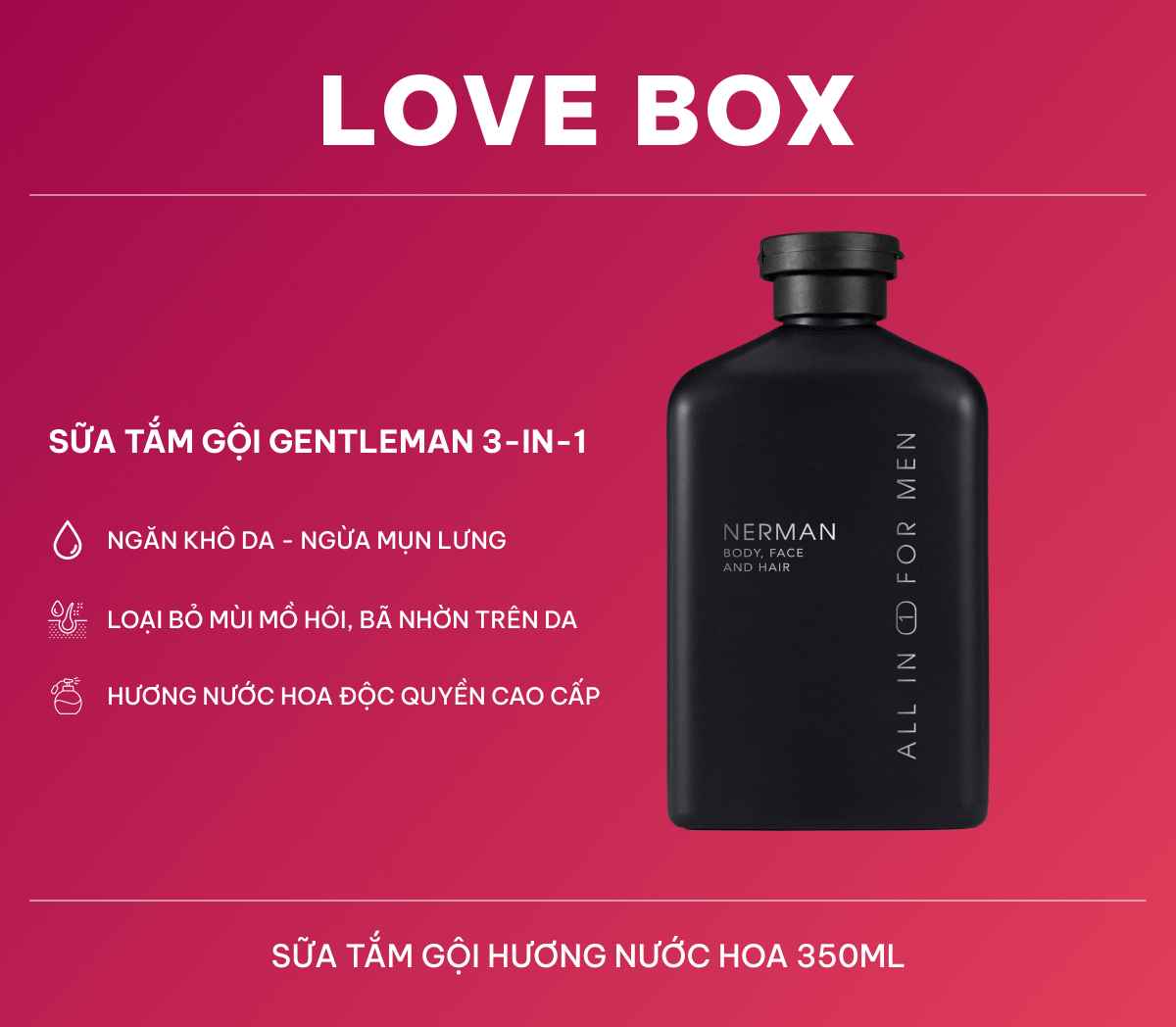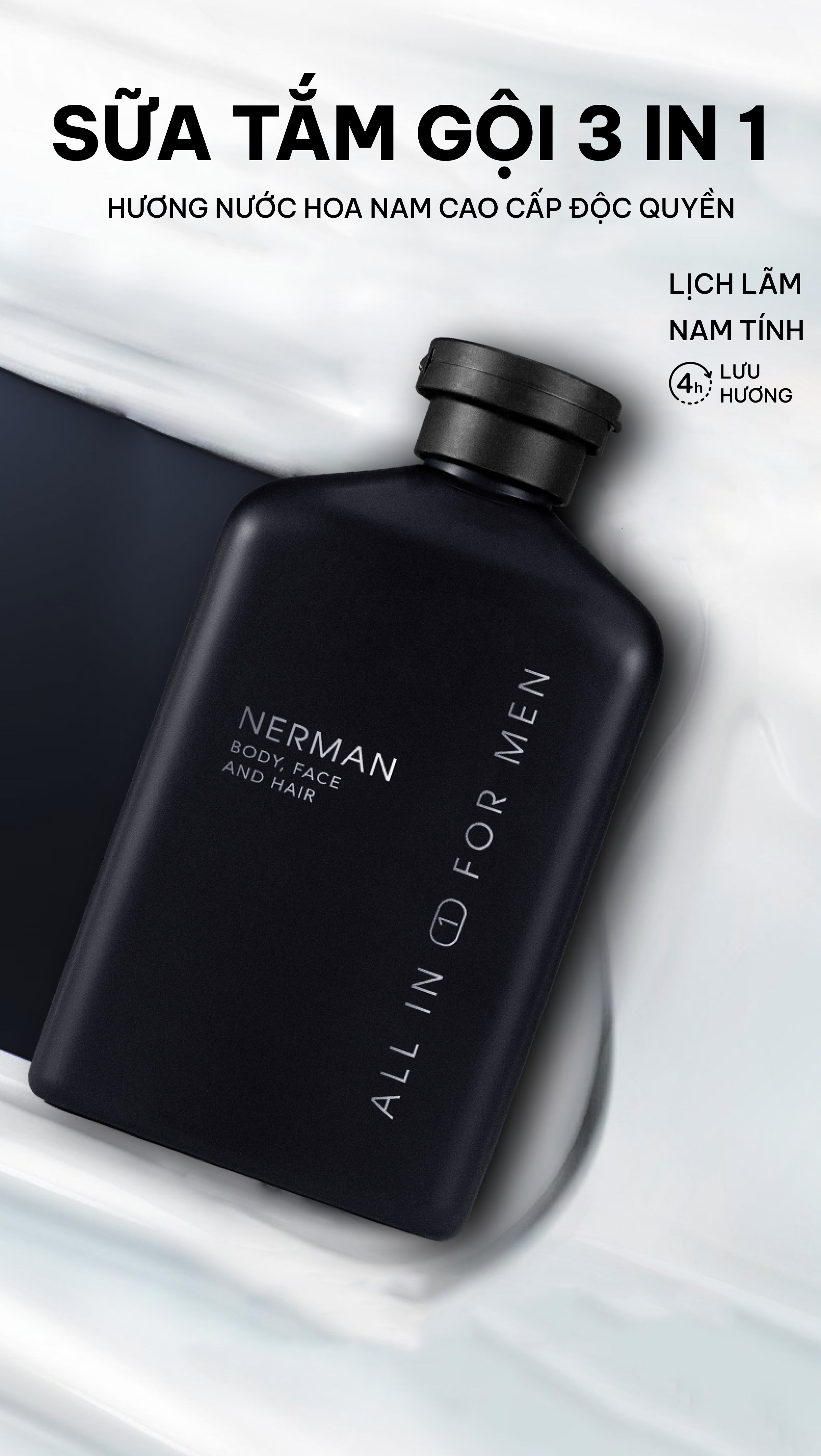 Sữa tắm hương nước hoa cao cấp là sản phẩm tiện lợi với sự tích hợp 3 công dụng trong 1: tắm, rửa mặt , gội đầu. Một sản phẩm tiện dụng tất cả trong một với hương nước hoa cao cấp và độ lưu hương lên tới 8h dành cho phái mạnh.