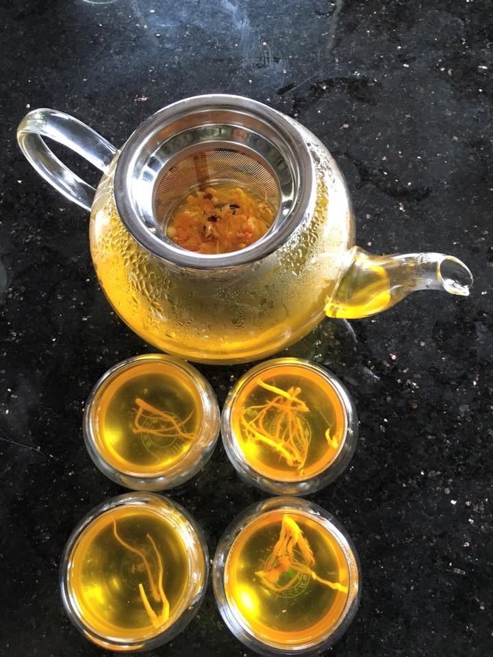 Uống dạng trà: Cho 1 túi 0.3 gr hoặc 6 -8 cọng đông trùng hạ thảo khôvào ly,đổ khoảng 100ml nước nóng ≥ 60 oC khoảng3 phút là uống được. Trường hợp ly có nắp đậy lại càng giúp thức uống thêm thơm ngon. Sau khi uống hết ăn luôn phần quả thể đông trùng hạ thảo rất tốt cho sức khoẻ.