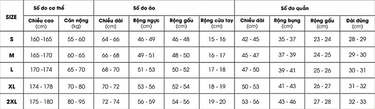 Tương tự các thông số khác, các bạn vui lòng dựa vào thông số ở trên để chọn kích cỡ phù hợp với bản thân mình nhé!